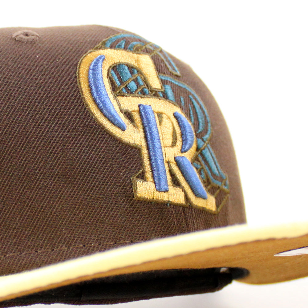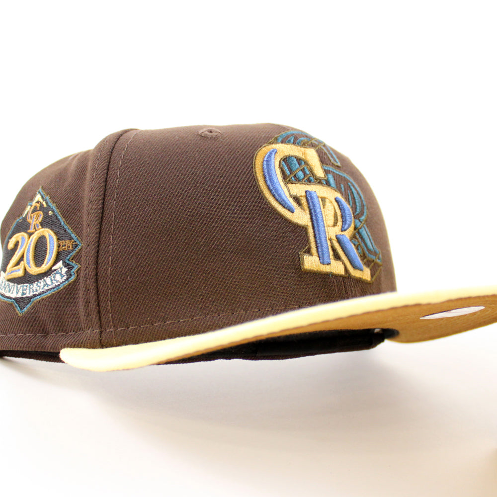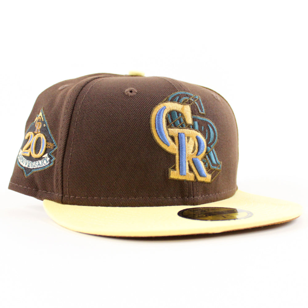 Colorado Rockies 20th Anniversary New Era 59Fifty Fitted Cap in Burnt Wood, Soft Yellow and Toasted Under Brim.