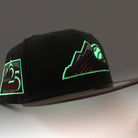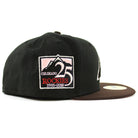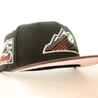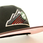 Colorado Rockies 25th Anniversary New Era 59Fifty Fitted Hat in Cotton Canvas Black With Burnt Wood, Metallic Red, Pink and Pink Under Brim.