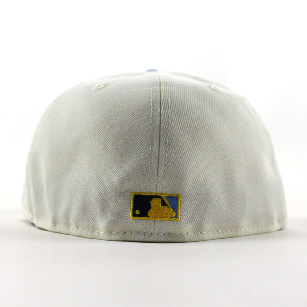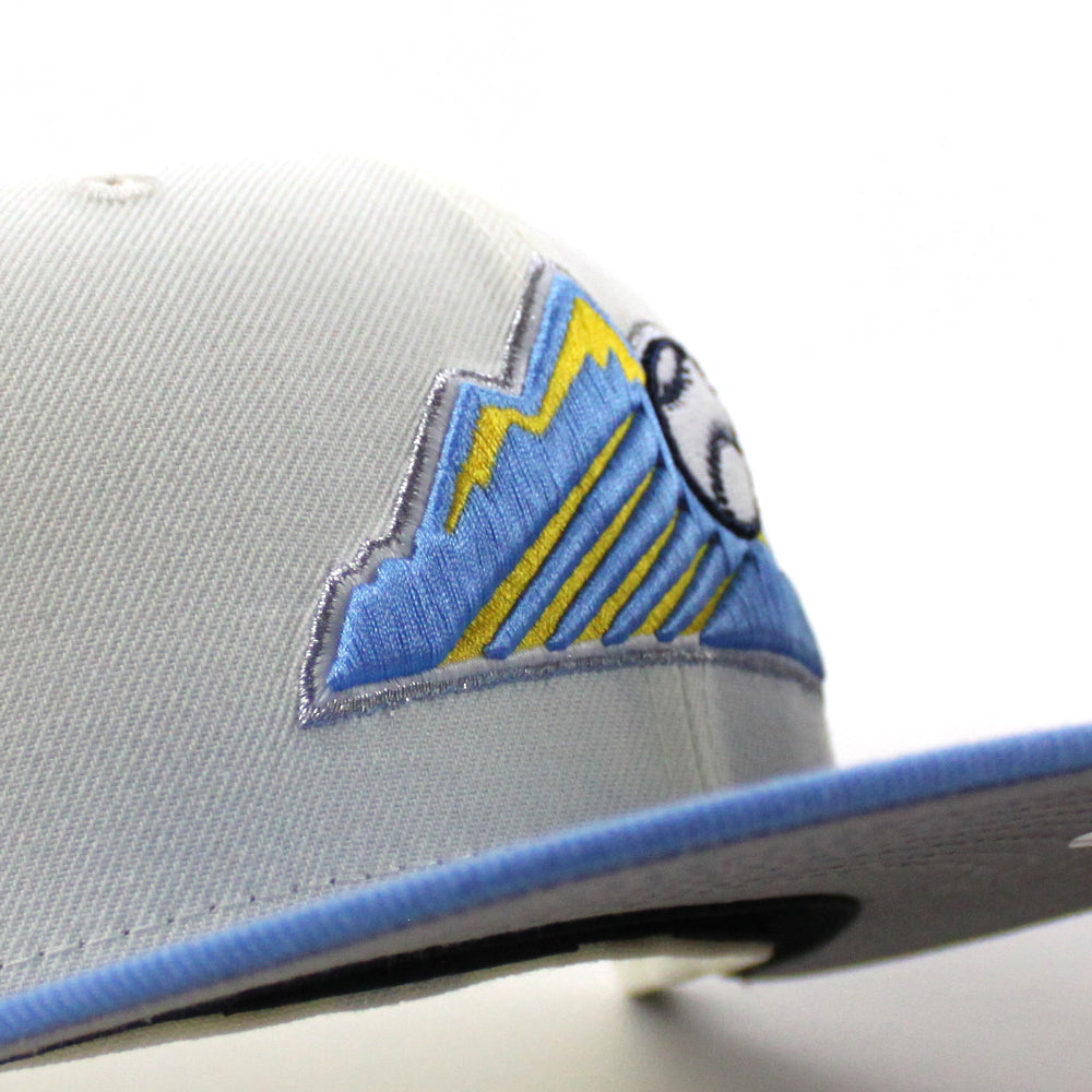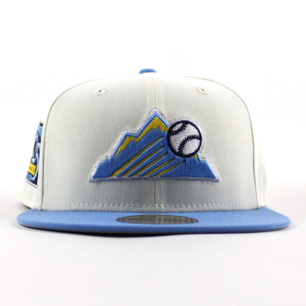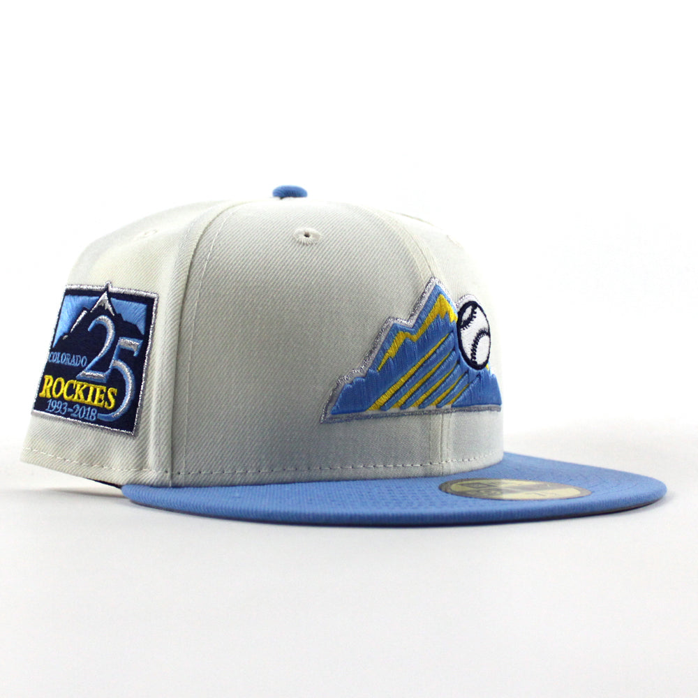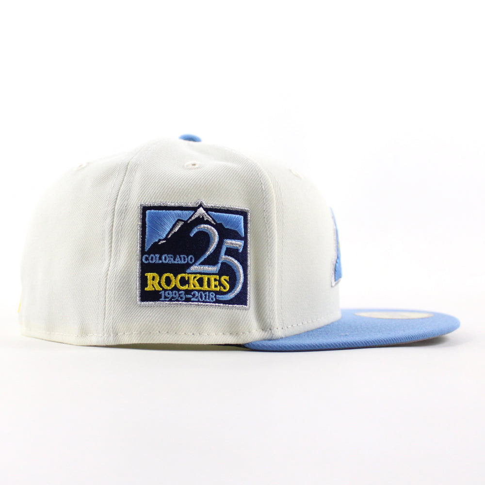 Colorado Rockies 25th Anniversary New Era 59Fifty Fitted Cap in Chrome White, Light Blue and Gray Under Brim.