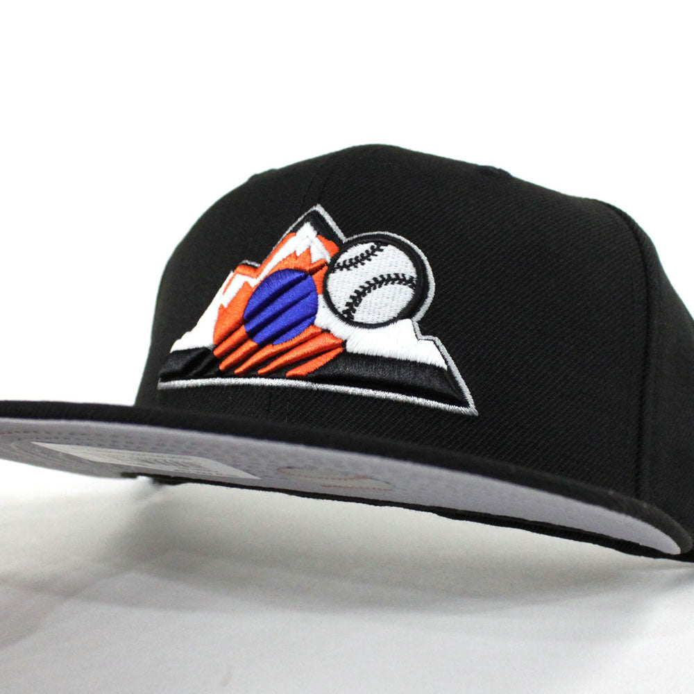 Colorado Rockies New Era 59Fifty Fitted Hat is Black, Orange and Blue with Gray Under Brim.