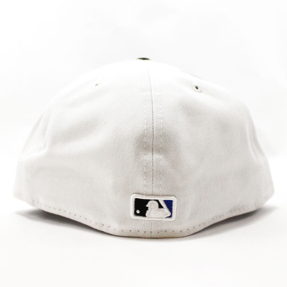 The Colorado Rockies New Era Fitted 59Fifty Hat is featured on a white based hat. It has a black visor and black and royal blue in the logo.
