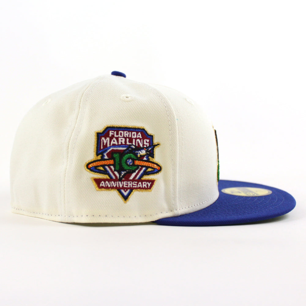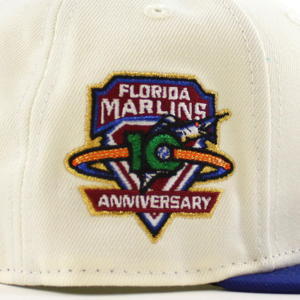 Florida Marlins 10th Anniversary New Era 59Fifty Fitted Hat in Chrome White, Royal Blue and Green Under brim.