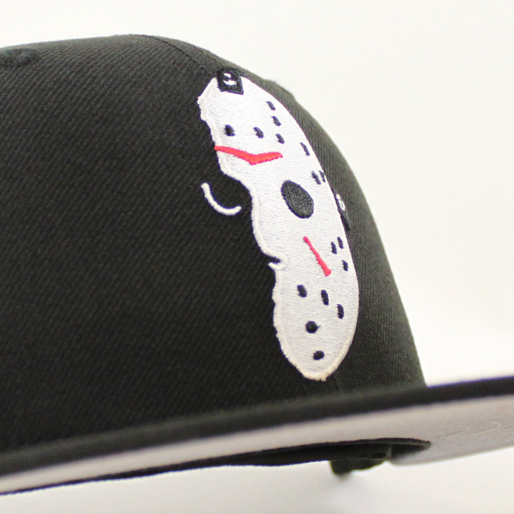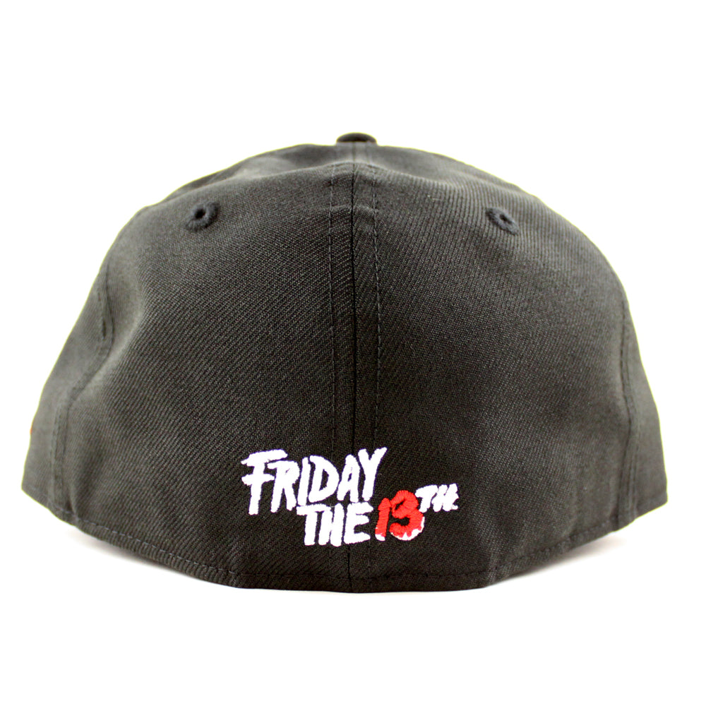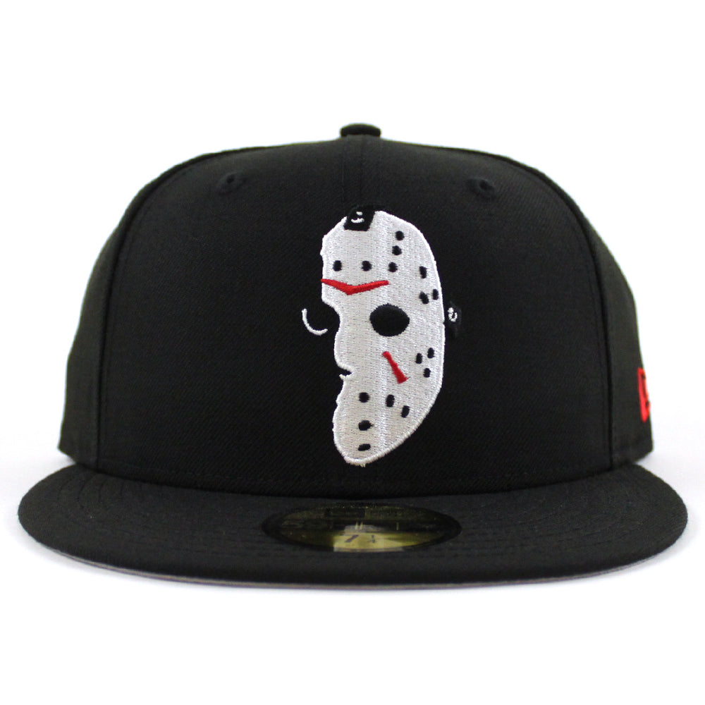 Friday the 13th Jason Head New Era 59Fifty Fitted Hat in Black and Red Gray Under Brim.