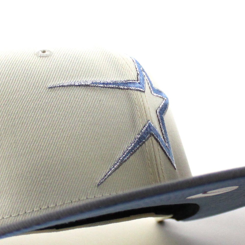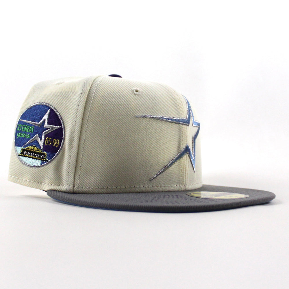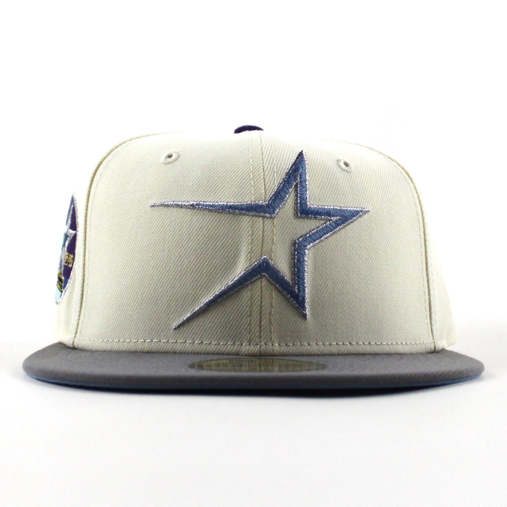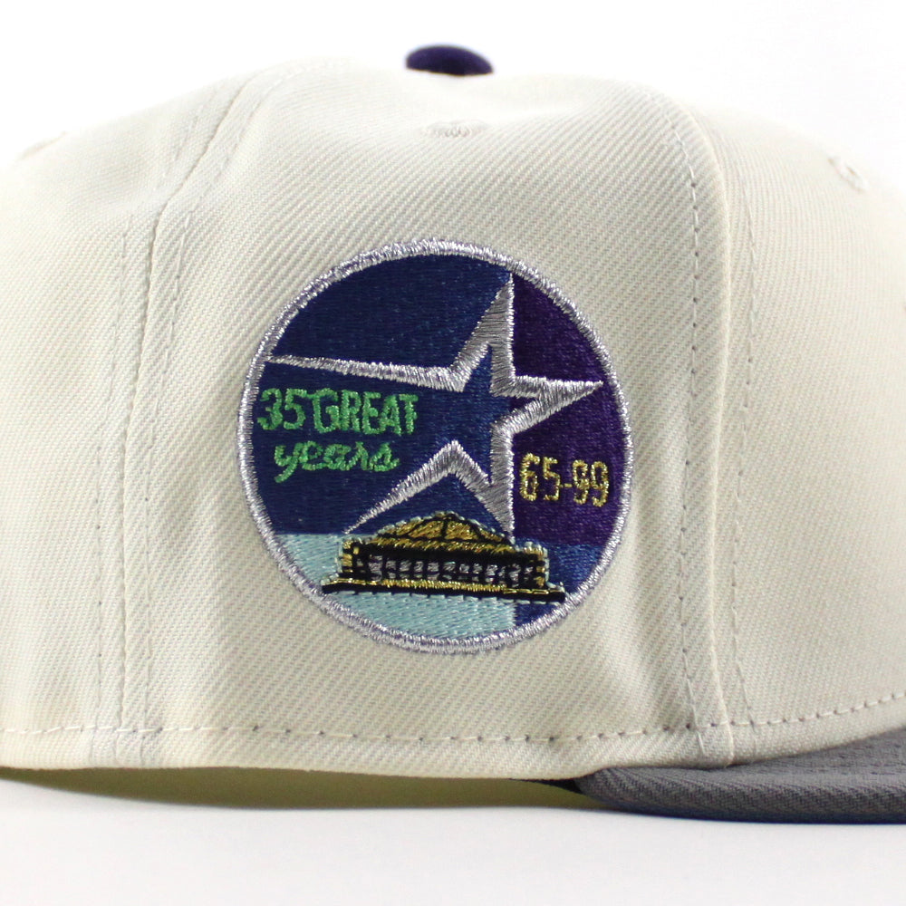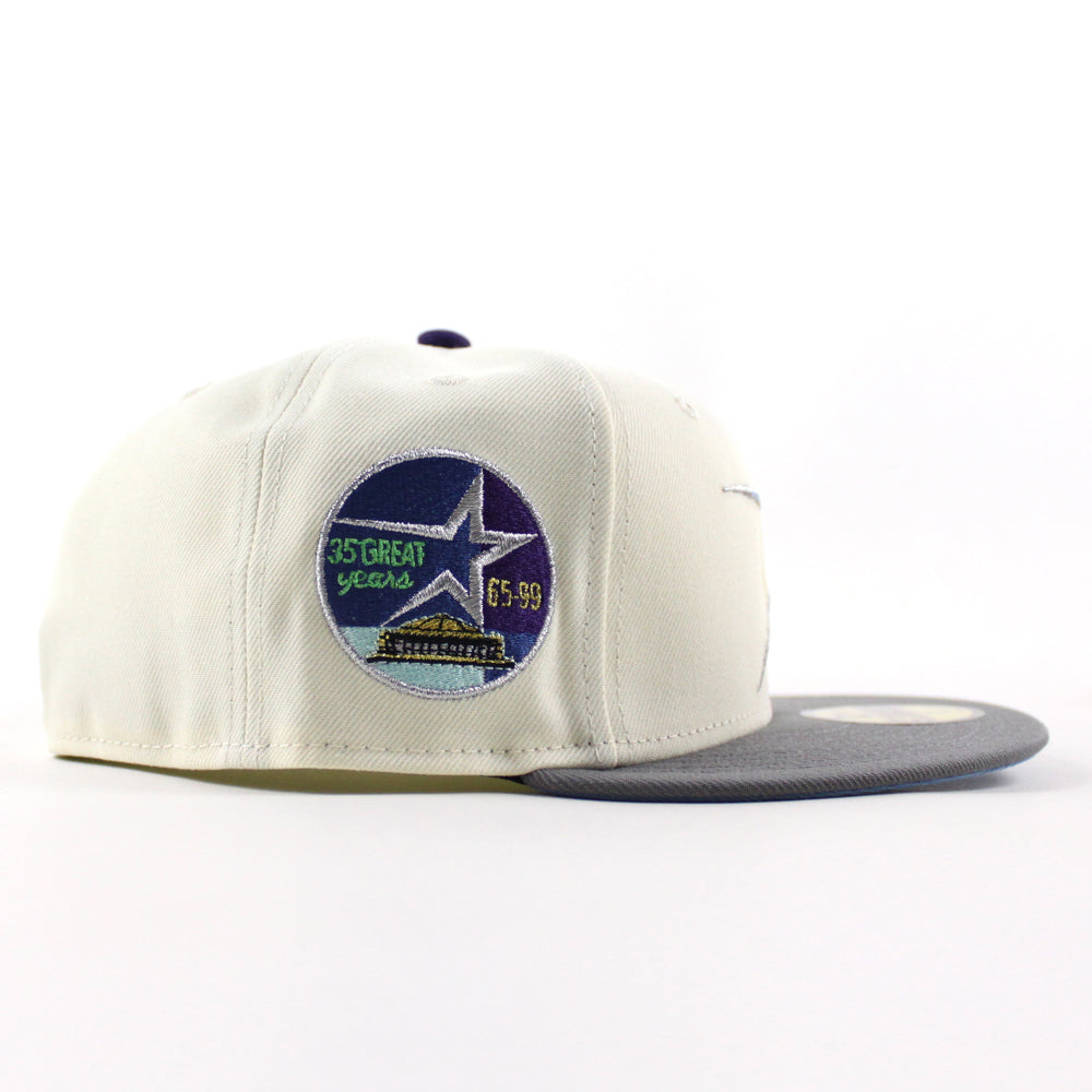 Houston Astros 35 Great Years New Era 59Fifty Fitted Hat in Chrome White, Storm Gray and Blue Under Brim.