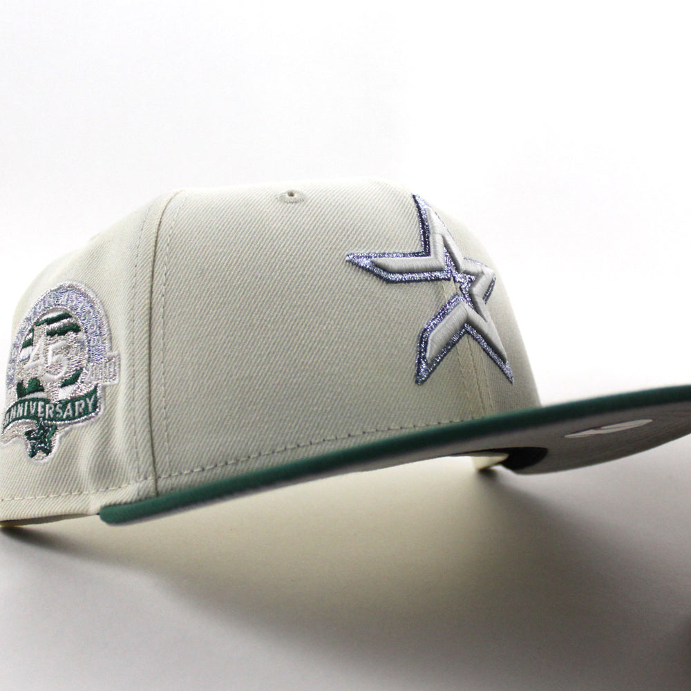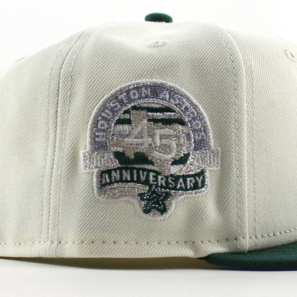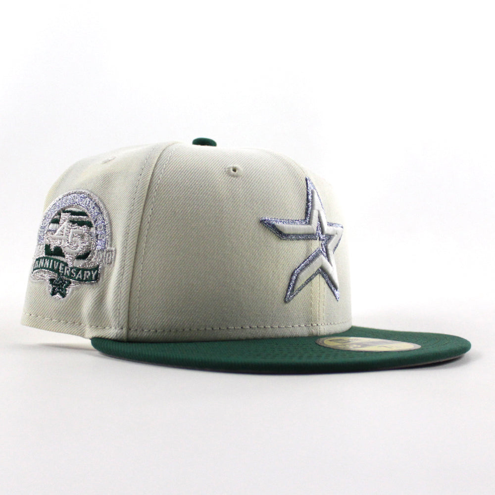 Houston Astros 45th Anniversary New Era 59Fifty Fitted Cap in Chrome White, Emerald Green and Gray Under Brim.