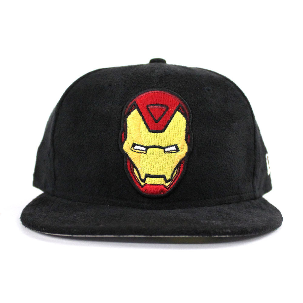 Iron Man New Era 59fifty Fitted Hat is custom made with DC Marvel comic designs. This Iron Man New Era 59fifty Fitted Cap is Black Flux Suede hat & Gray Under Brim