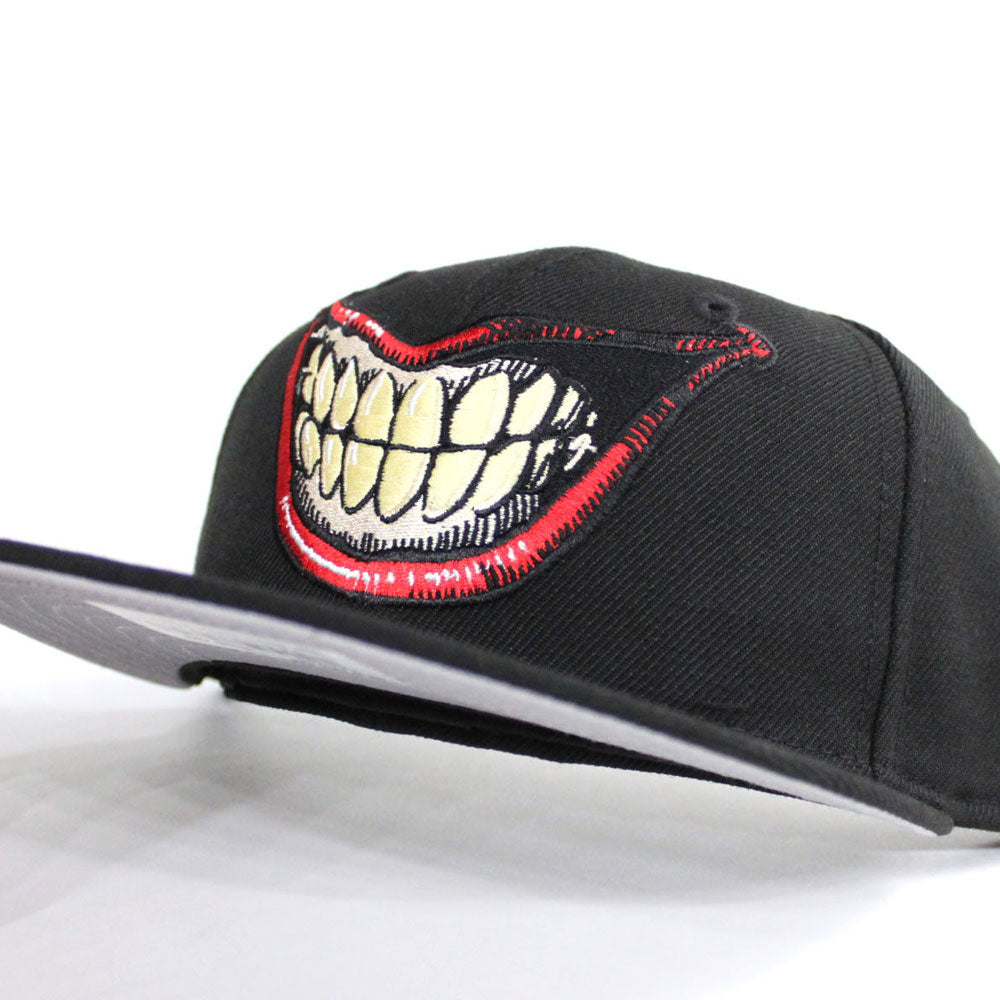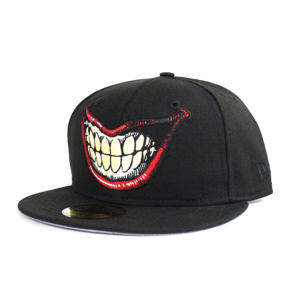 JOKER SMILE ‚ÄéDC Comics New Era 59Fifty Fitted Hat in Black with Gray Under Brim.