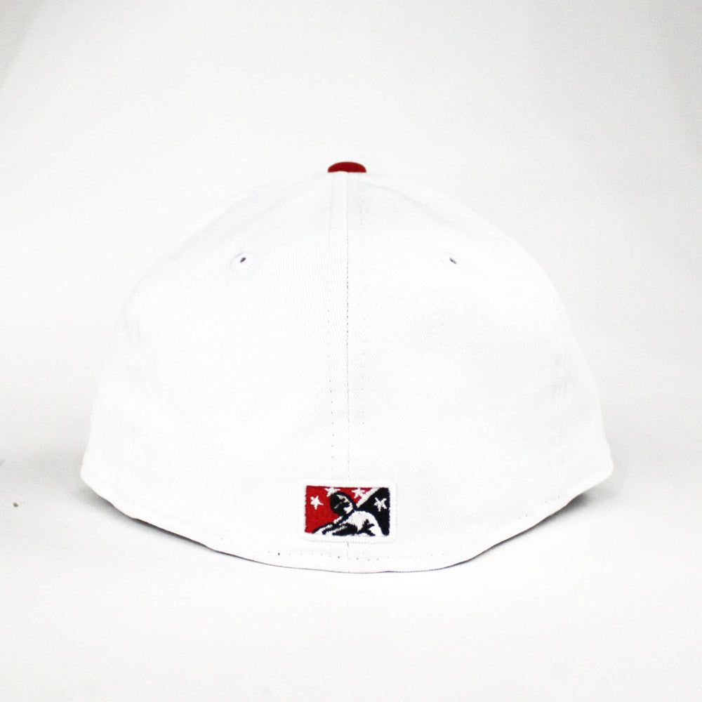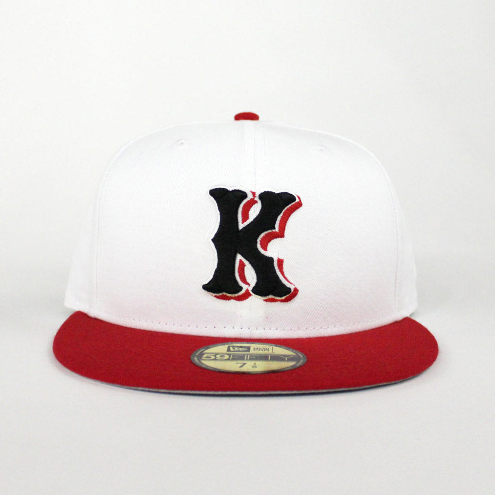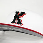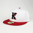 Kingsport Mets New Era Fitted hat custom made to match Air Jordan 1 Retros. The cap is white with a red brim and a black logo that has a red and white outline.