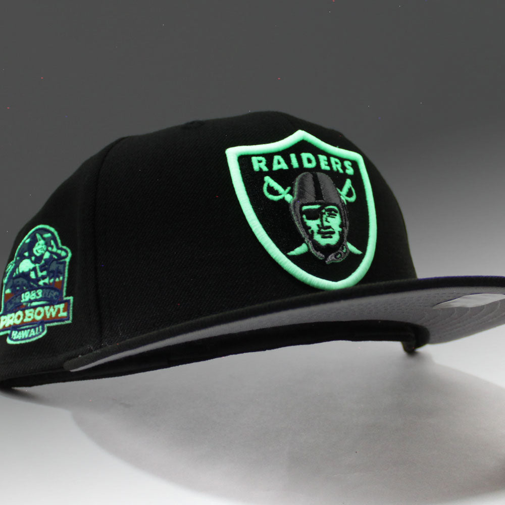Oakland Raiders 1983 PRO BOWL New Era 59Fifty Fitted Hat in Glow in the Dark, Black with Gray Under Brim. Logo: Glow in the Dark