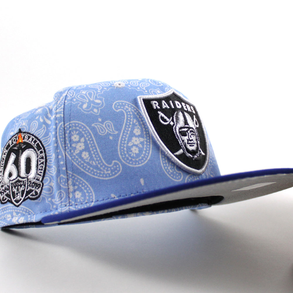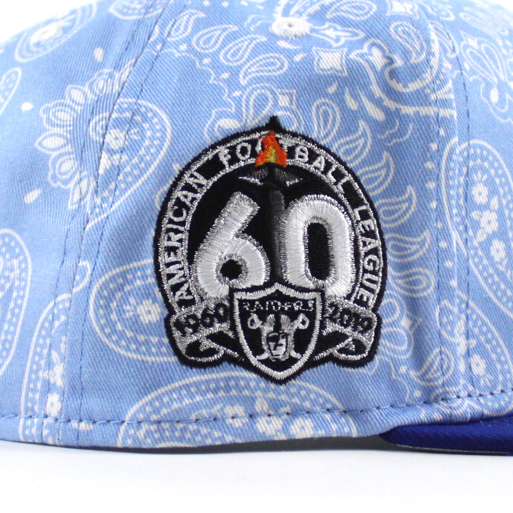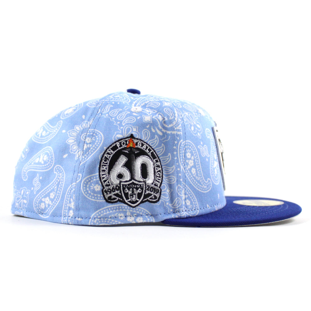 Las Vegas Raiders 60th Anniversary New Era 59Fifty Fitted Hat (Baby Blue Paisley Royal Blue Metallic Silver Under Brim)