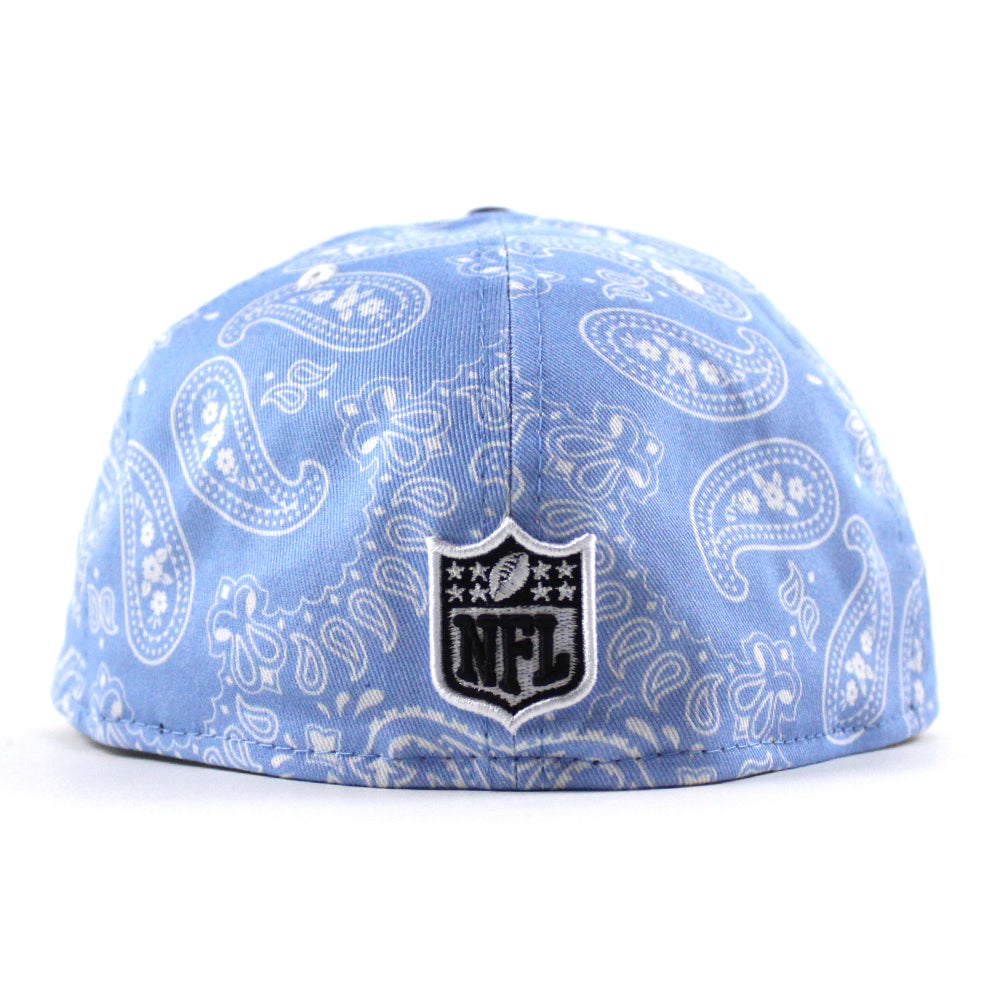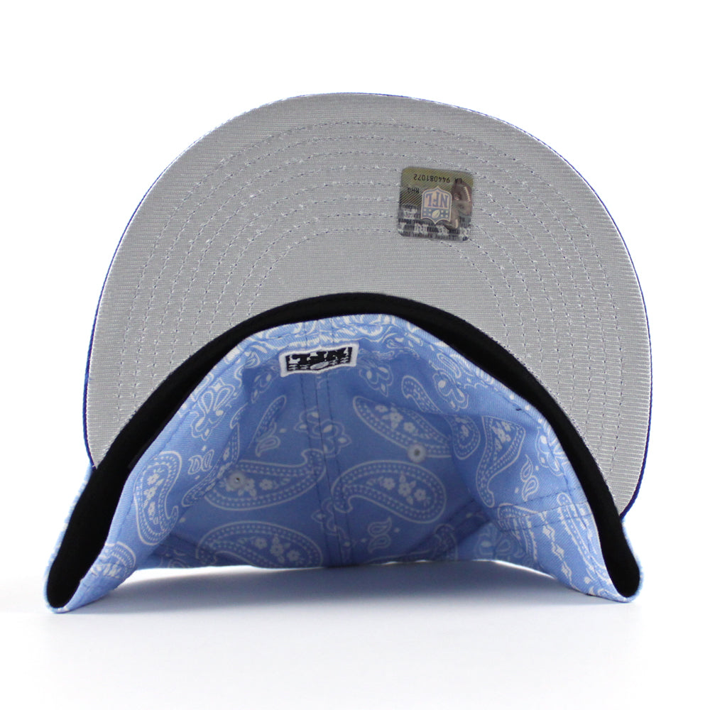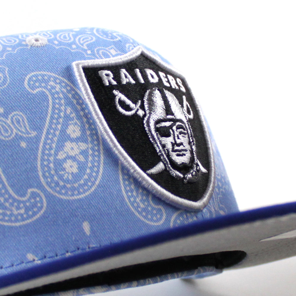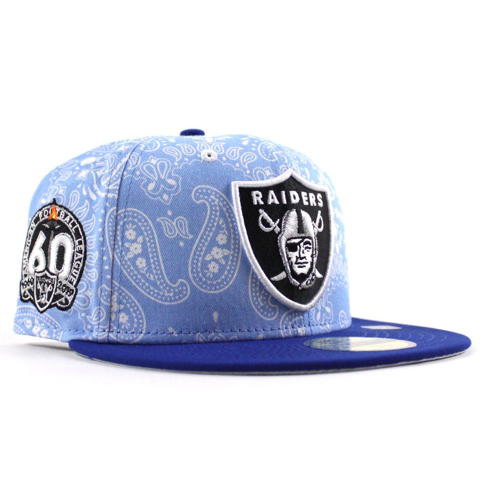 Las Vegas Raiders 60th Anniversary New Era 59Fifty Fitted Hat (Baby Blue Paisley Royal Blue Metallic Silver Under Brim)