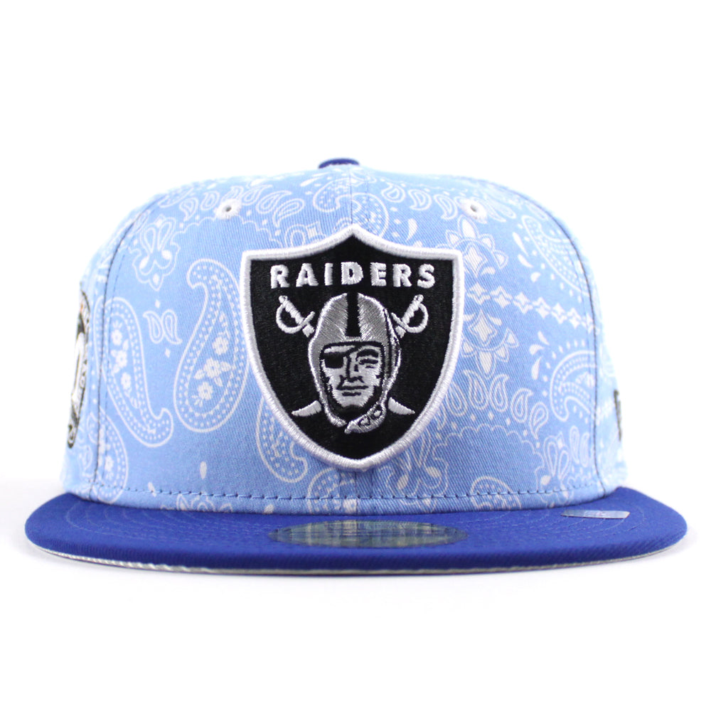 Las Vegas Raiders 60th Anniversary New Era 59Fifty Fitted Hat in Baby Blue Paisley, Royal Blue with Metallic Silver Under Brim.
