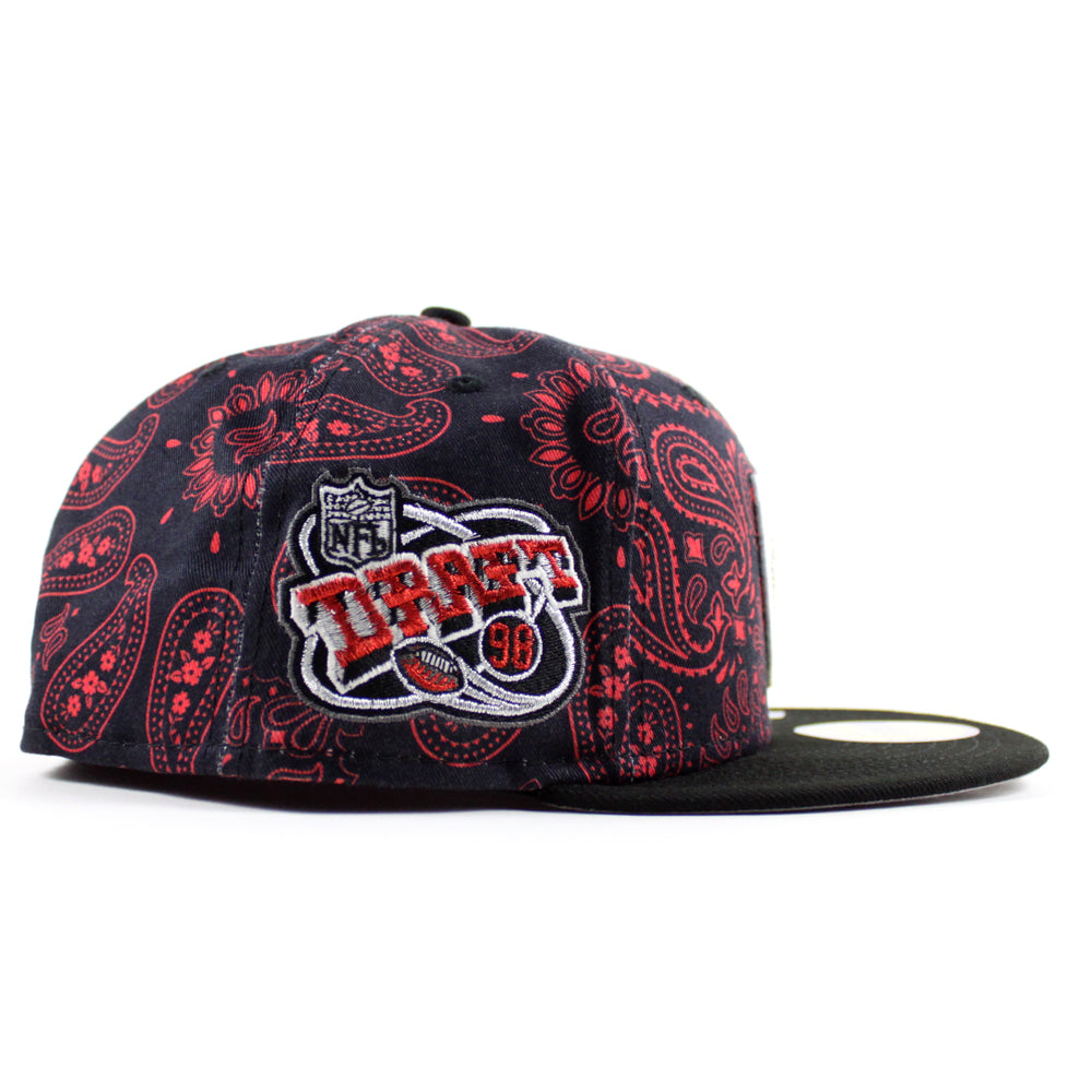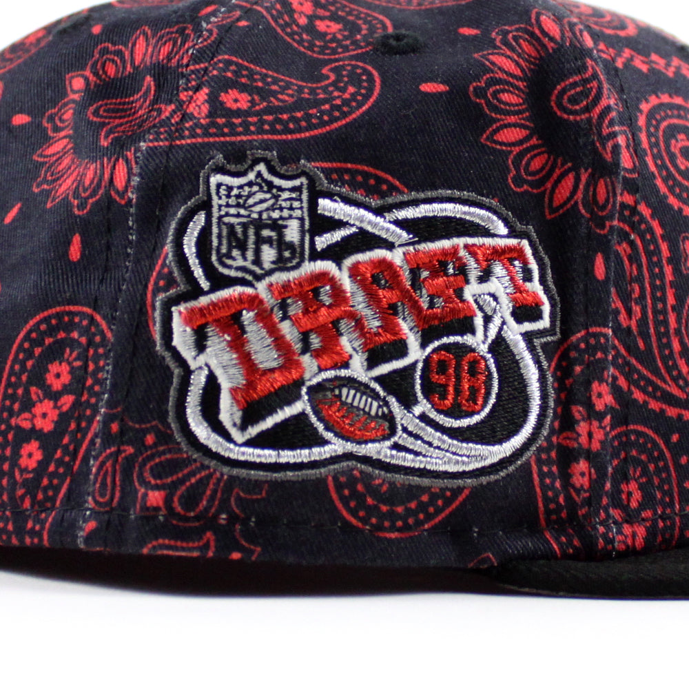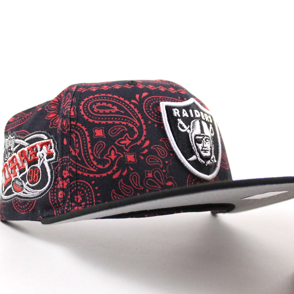 Las Vegas Raiders Draft 1998 New Era 59Fifty Fitted Hat in Red Paisley, Black with Gray Under Brim.