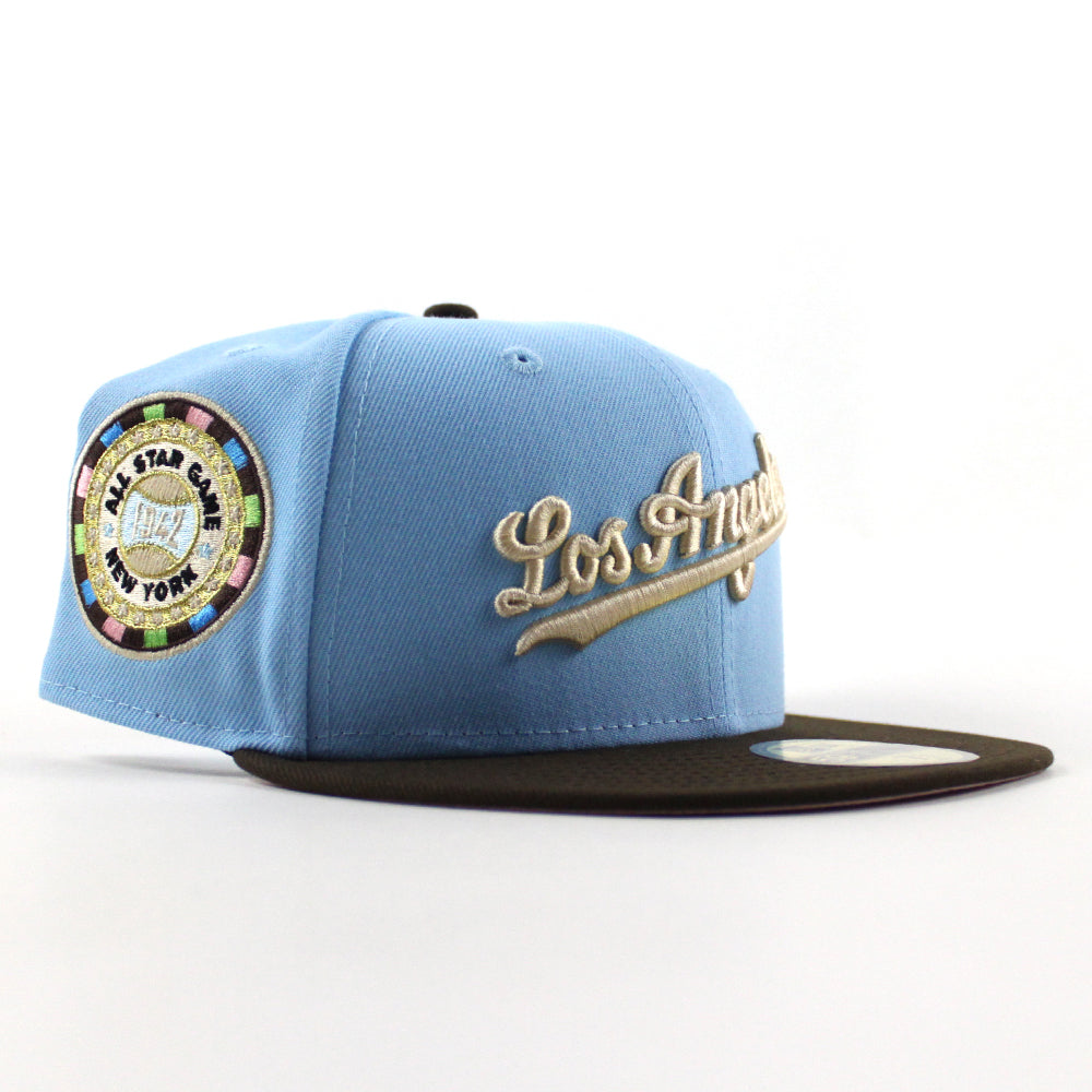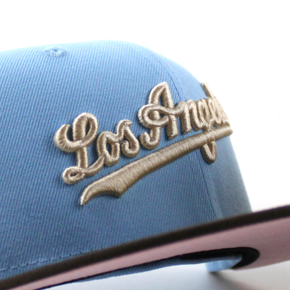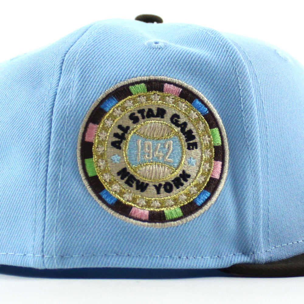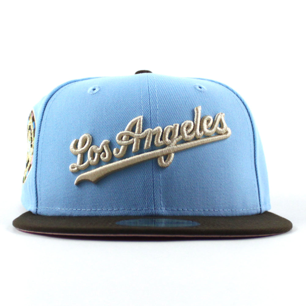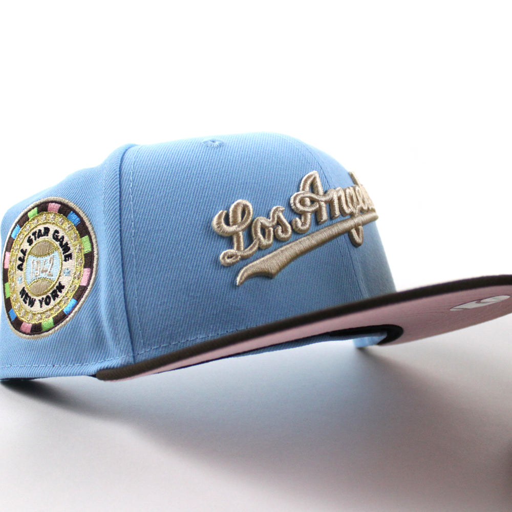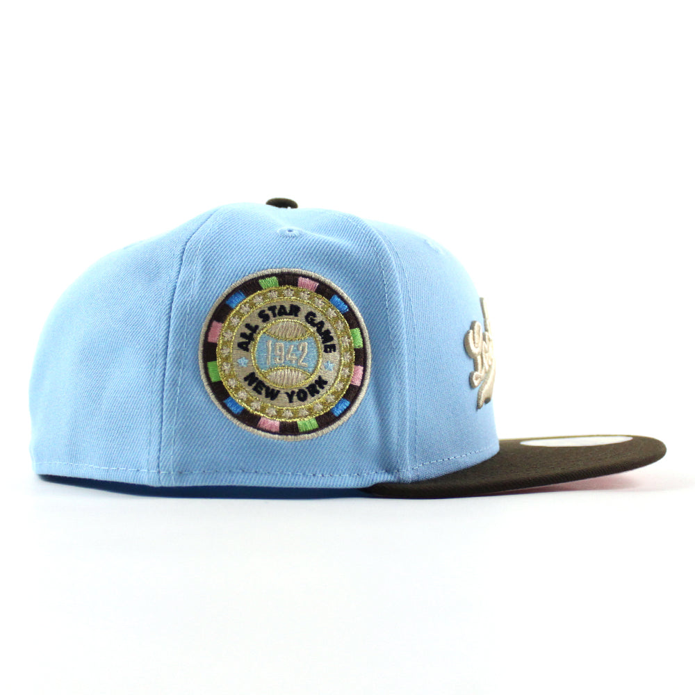 Los Angeles Dodgers 1942 All Star Game New Era 59Fifty Fitted Hat in Doscientos Blue, Walnut with a Pink Under Brim.