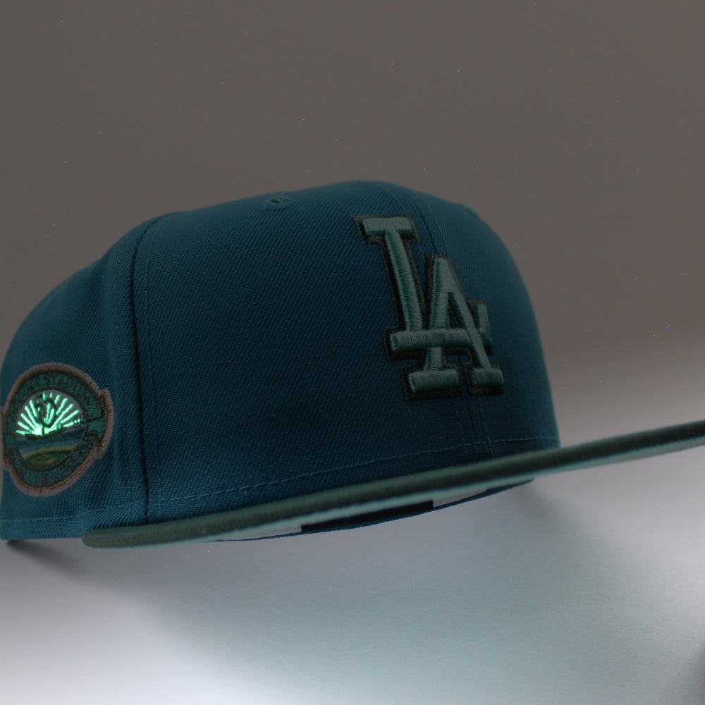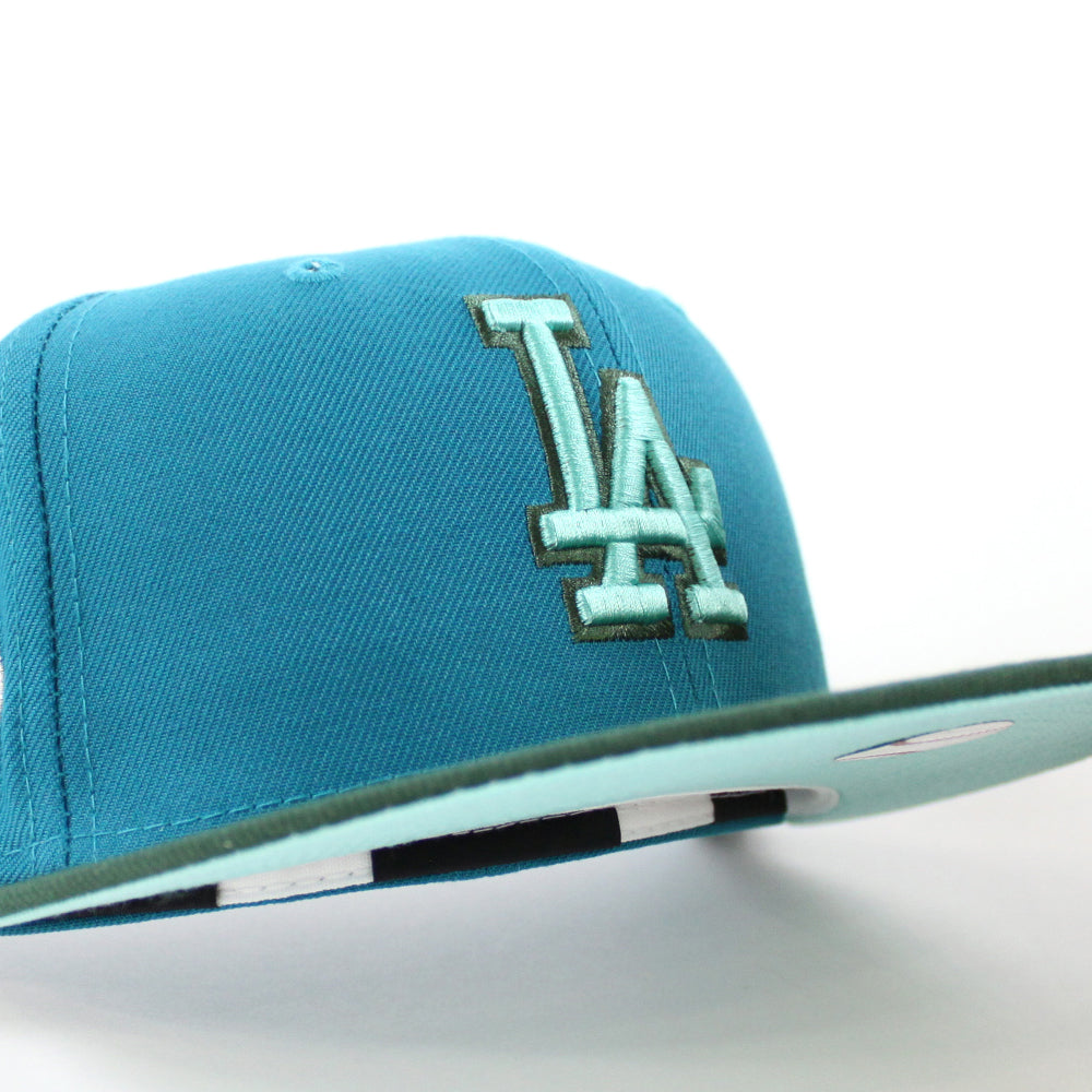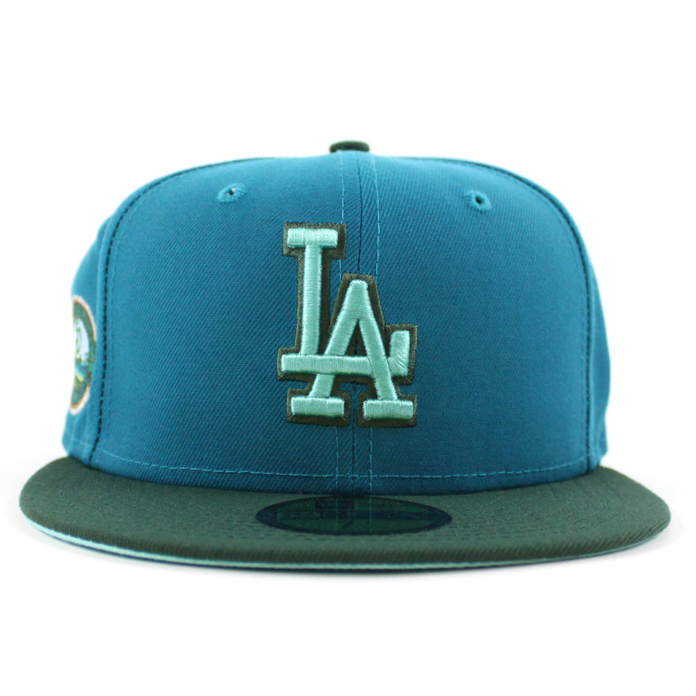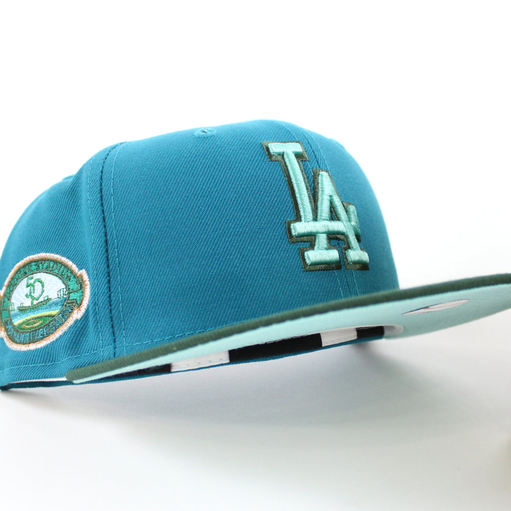 Los Angeles Dodgers 50th Anniversary New Era 59Fifty Fitted Hat in Teal, Olive & Mint Under Brim.