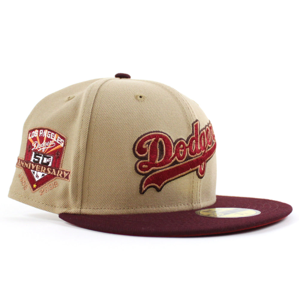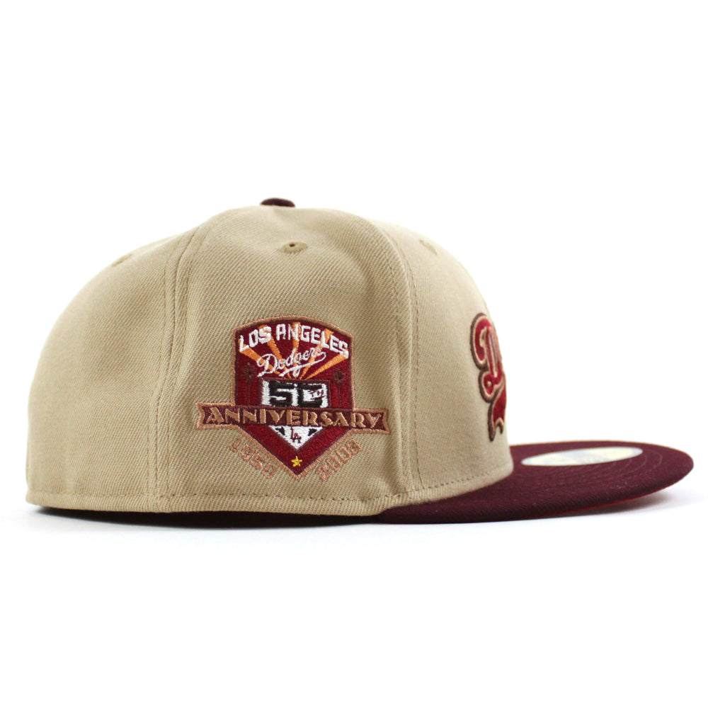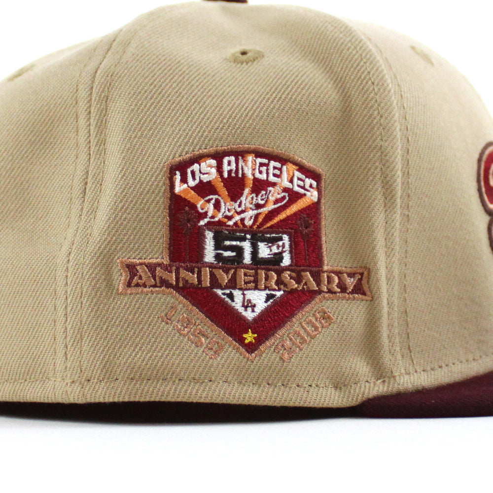 Los Angeles Dodgers 50th Anniversary DODGERS STADIUM New Era 59Fifty Fitted Hat (Camel Maroon Pinot Red Under Brim)