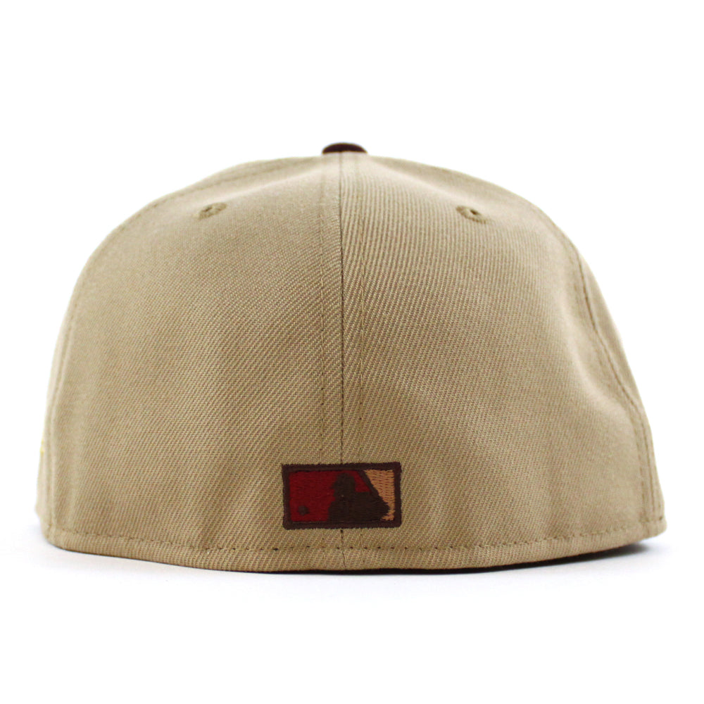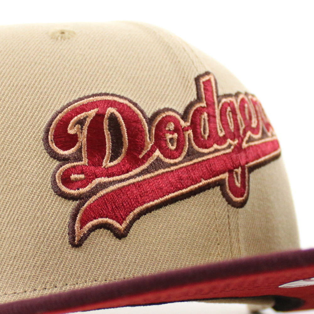 Los Angeles Dodgers 50th Anniversary DODGERS STADIUM New Era 59Fifty Fitted Hat in Camel, Maroon and Pinot Red Under Brim.