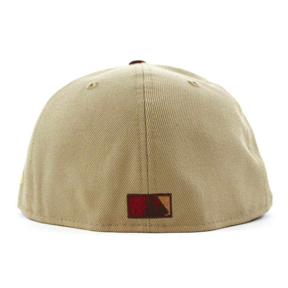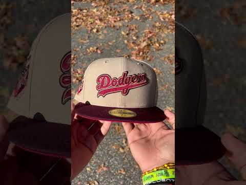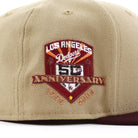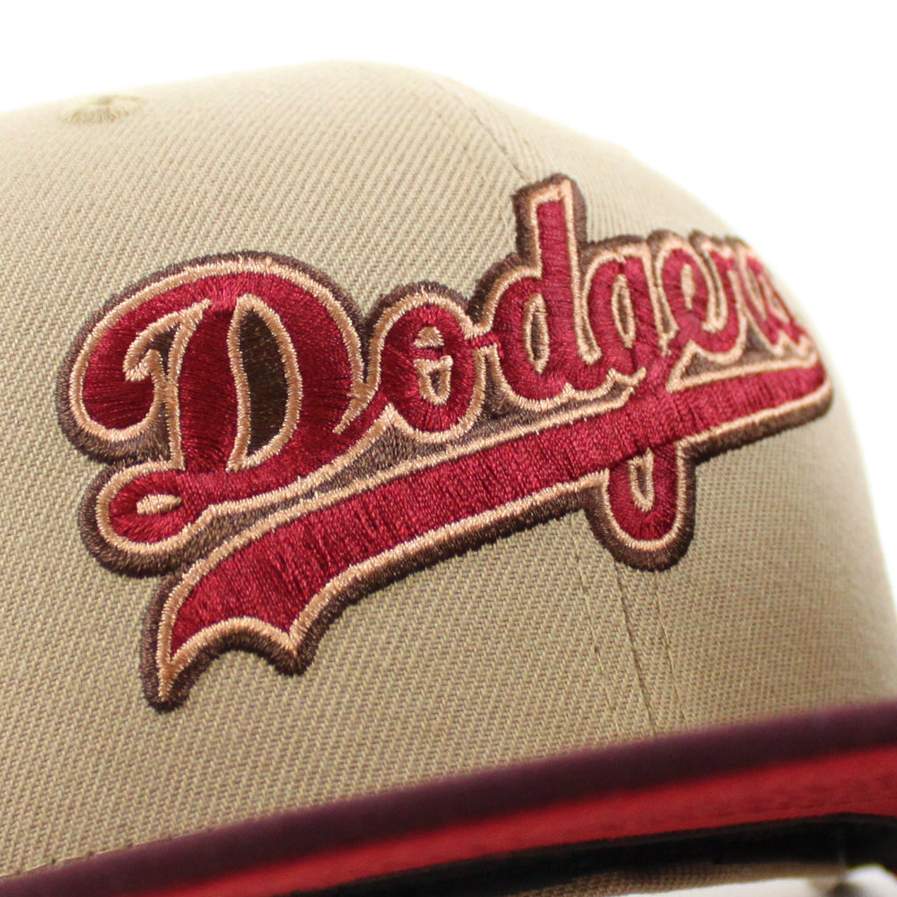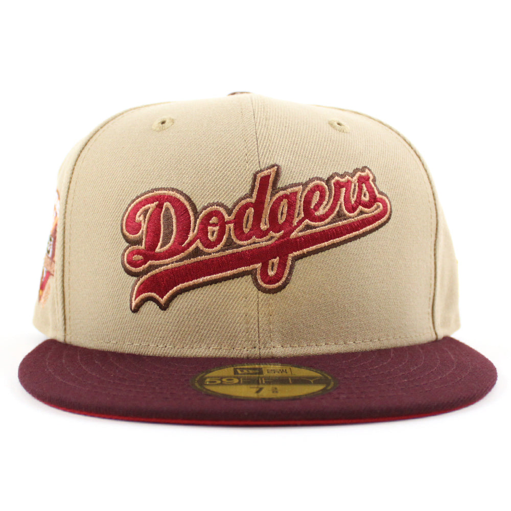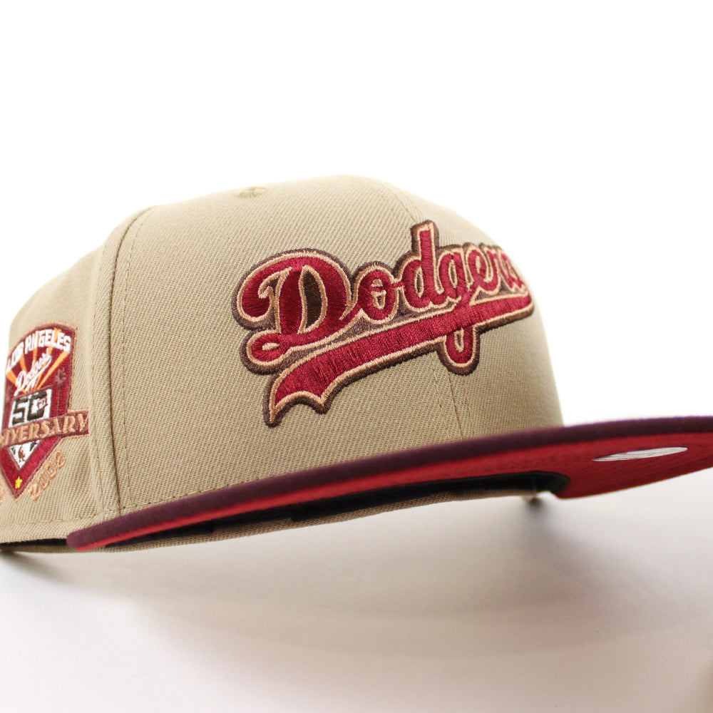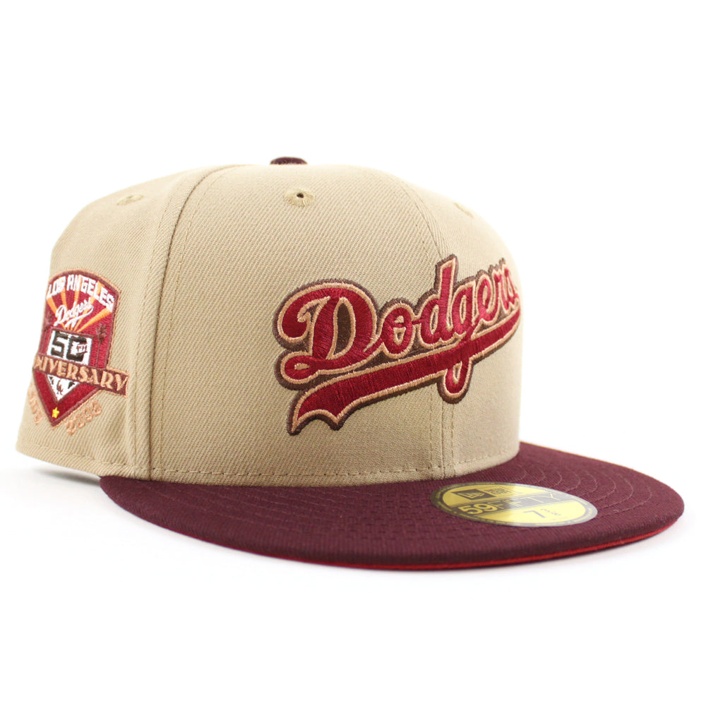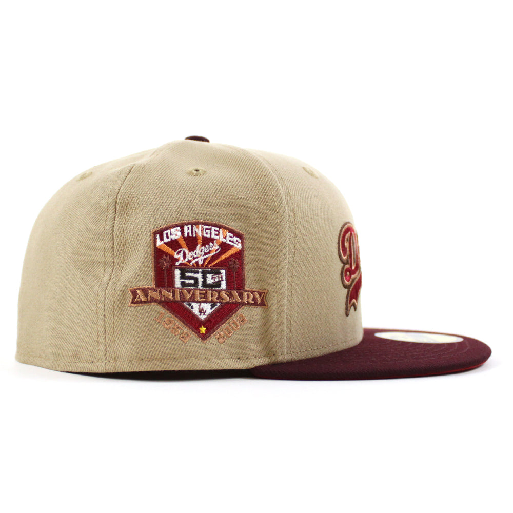 Los Angeles Dodgers 50th Anniversary New Era 59Fifty Fitted Hat in Camel, Maroon and Pinot Red Under Brim.
