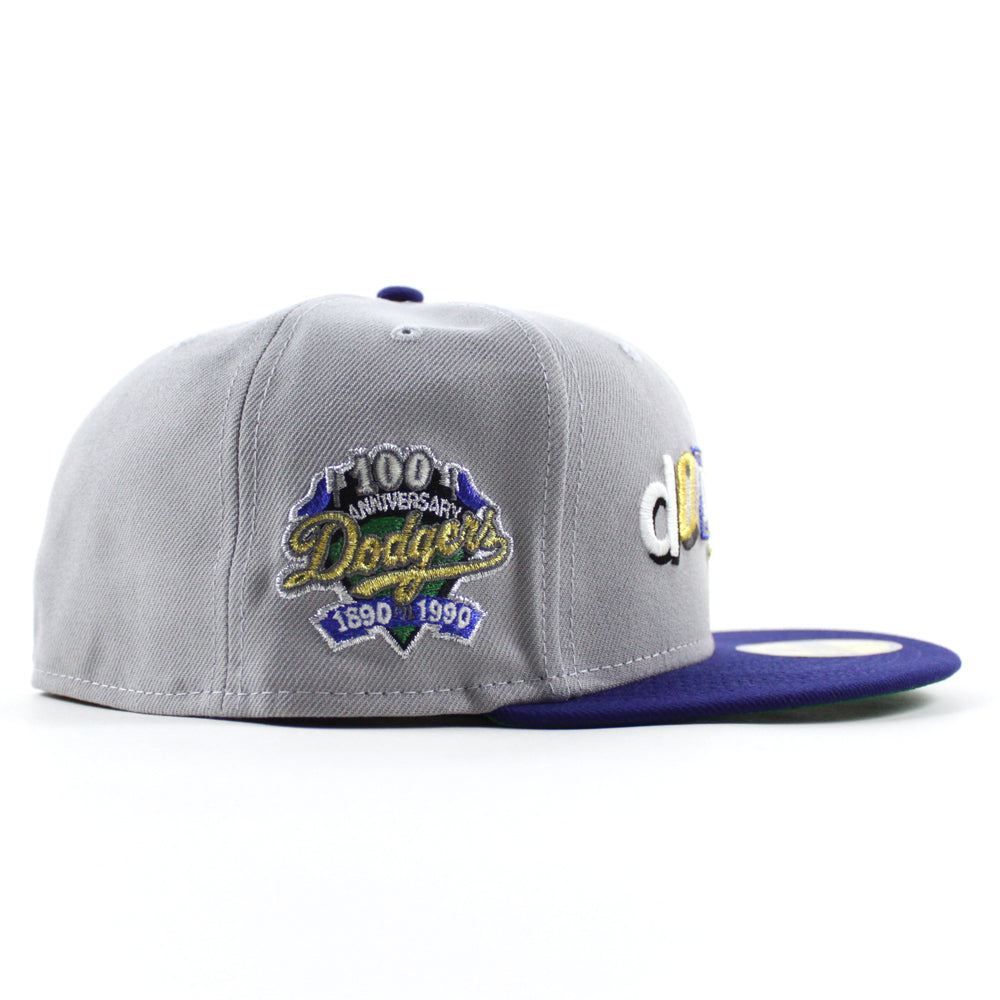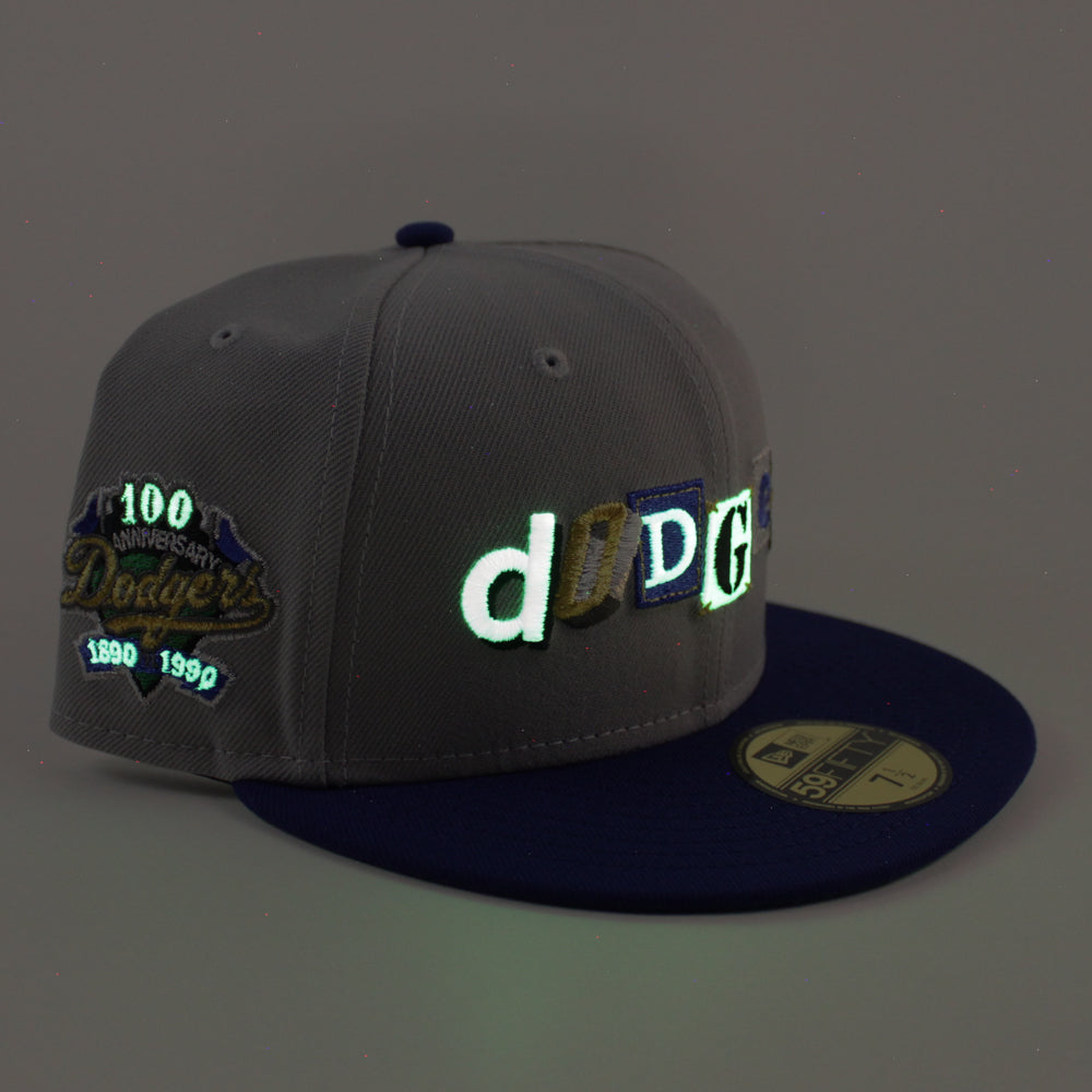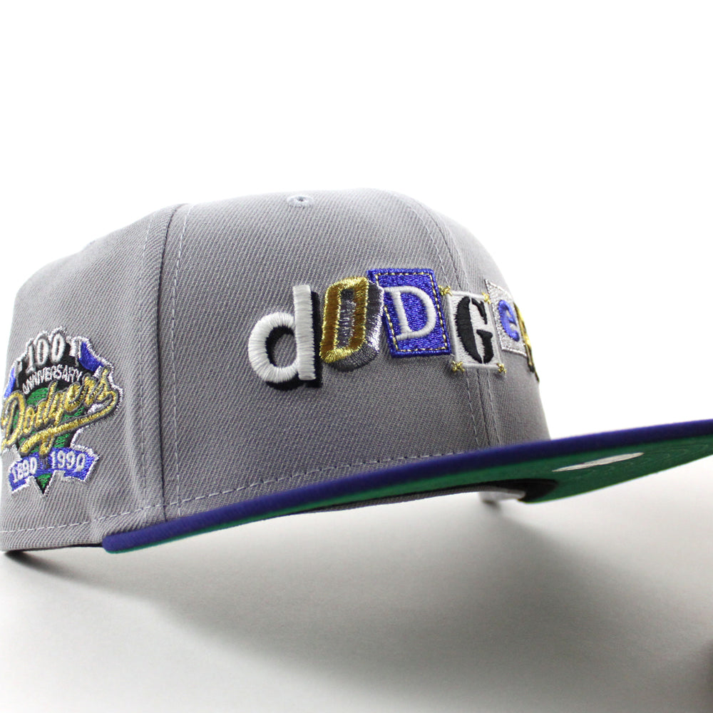 Los Angeles Dodgers Death Note 100 Years Patch New Era 59Fifty Fitted Hat in Gray, Royal Blue and Green Under Brim.