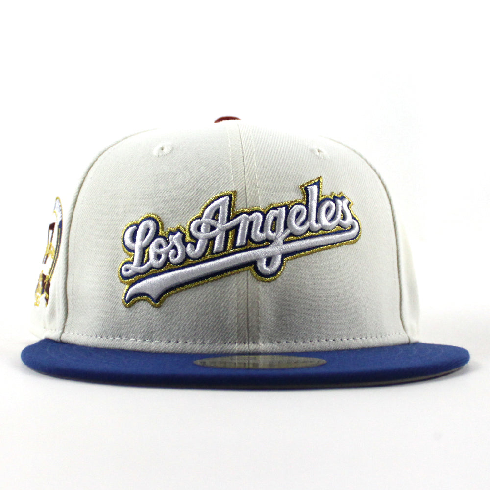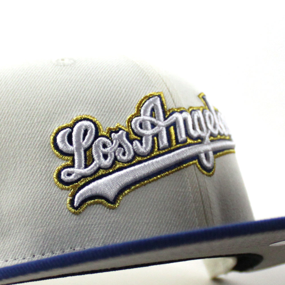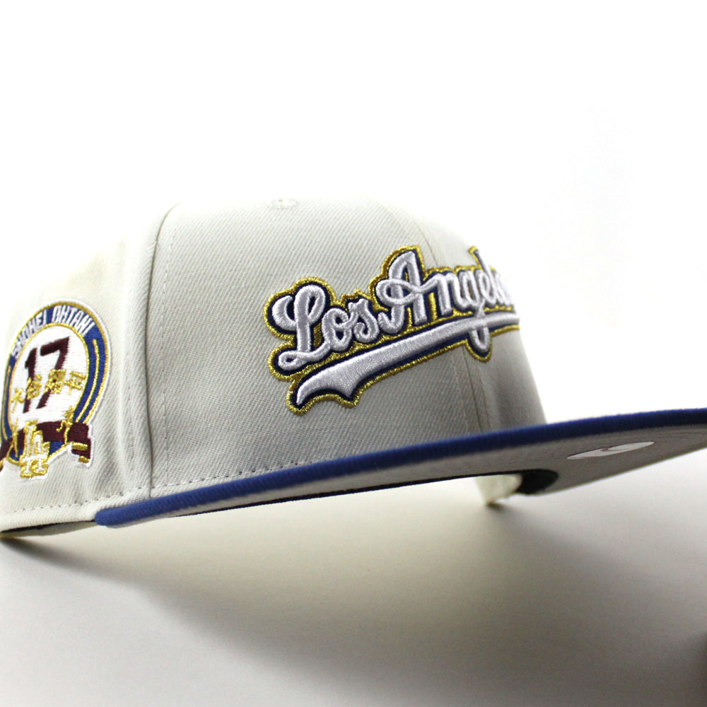 Los Angeles Dodgers Ohtani (大谷翔平) 17 Patch New Era 59Fifty Fitted Hat in Chrome White Song Bird Blue and Gray Under Brim.