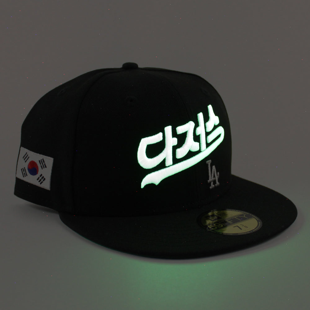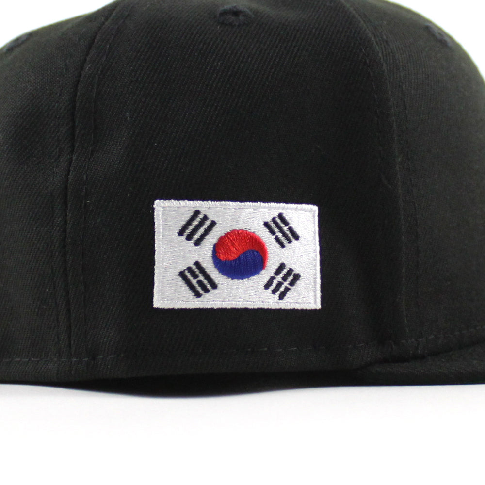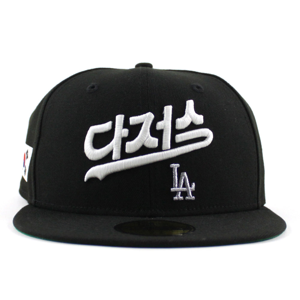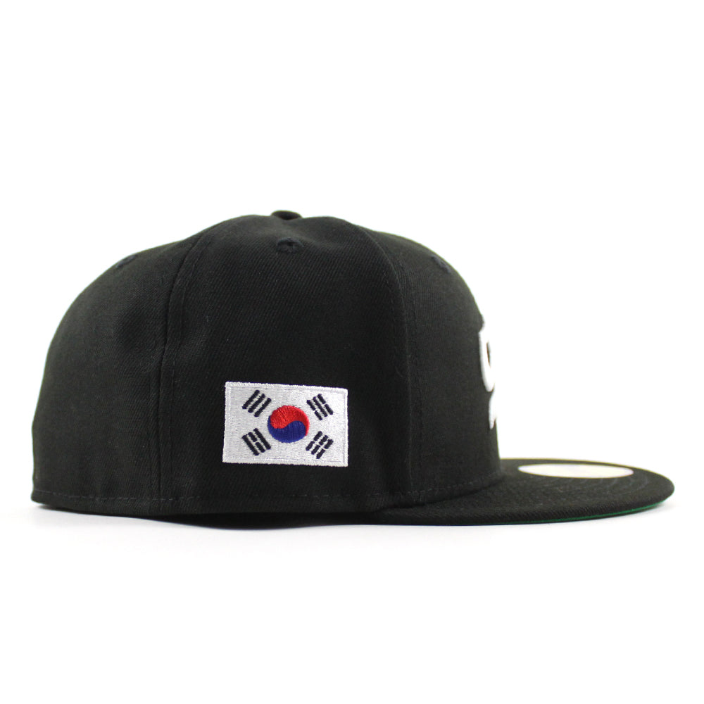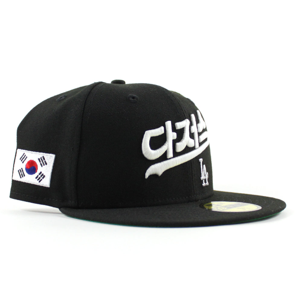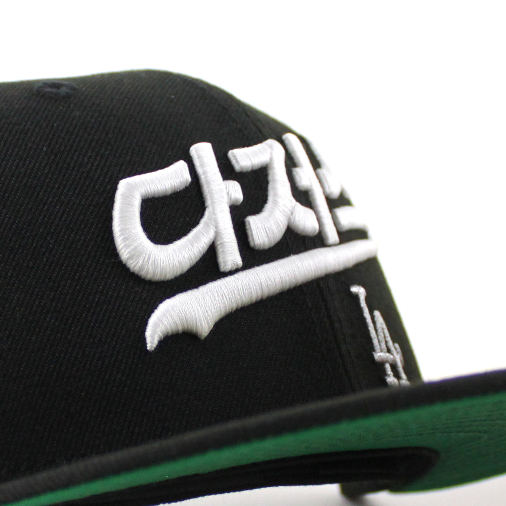 Korean x Los Angeles Dodgers (다저스) New Era 59Fifty Fitted Hat in Black and Green Under Brim.