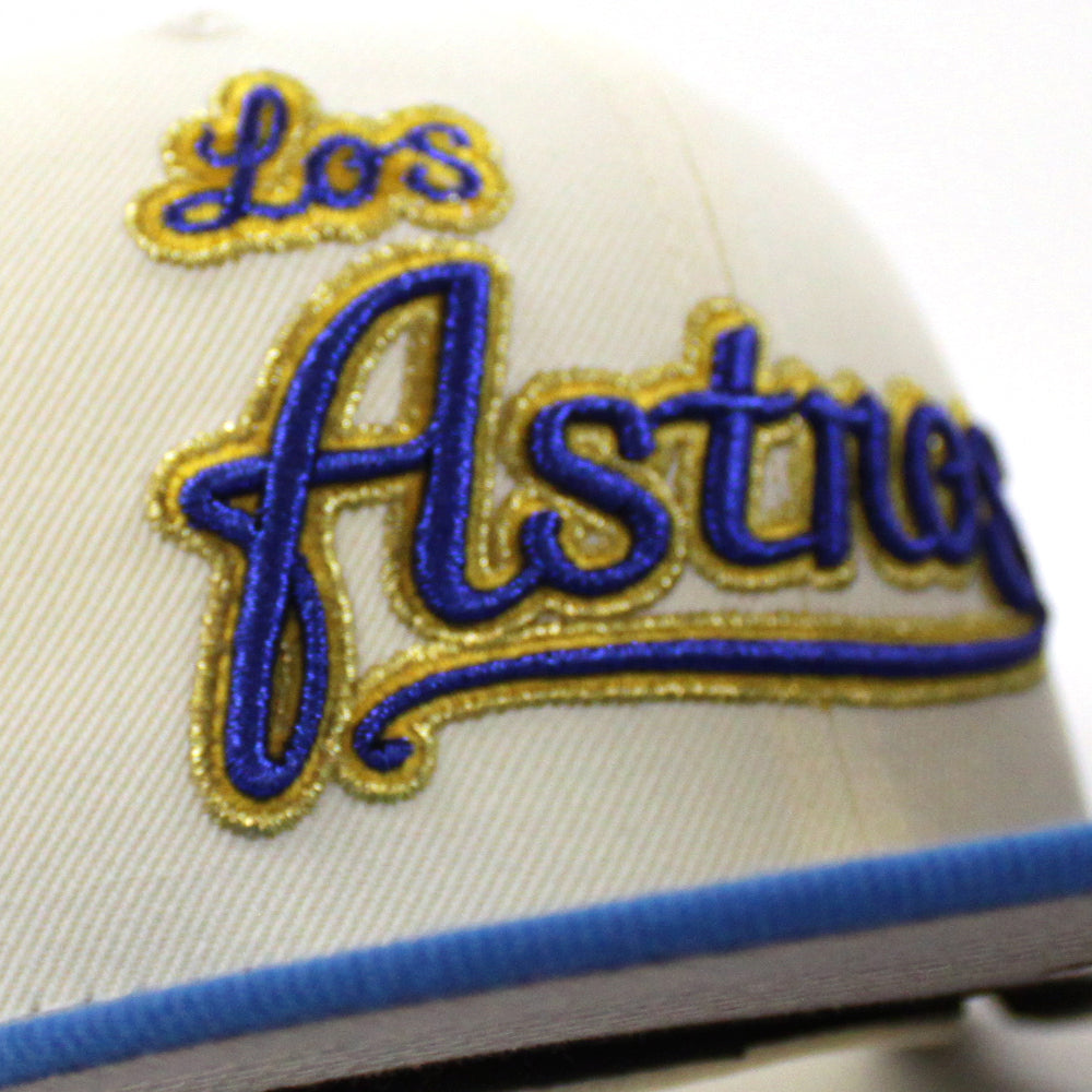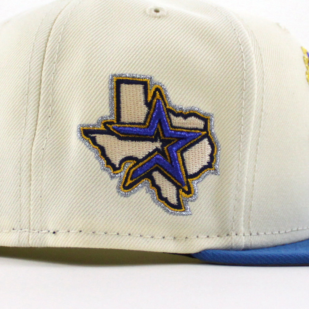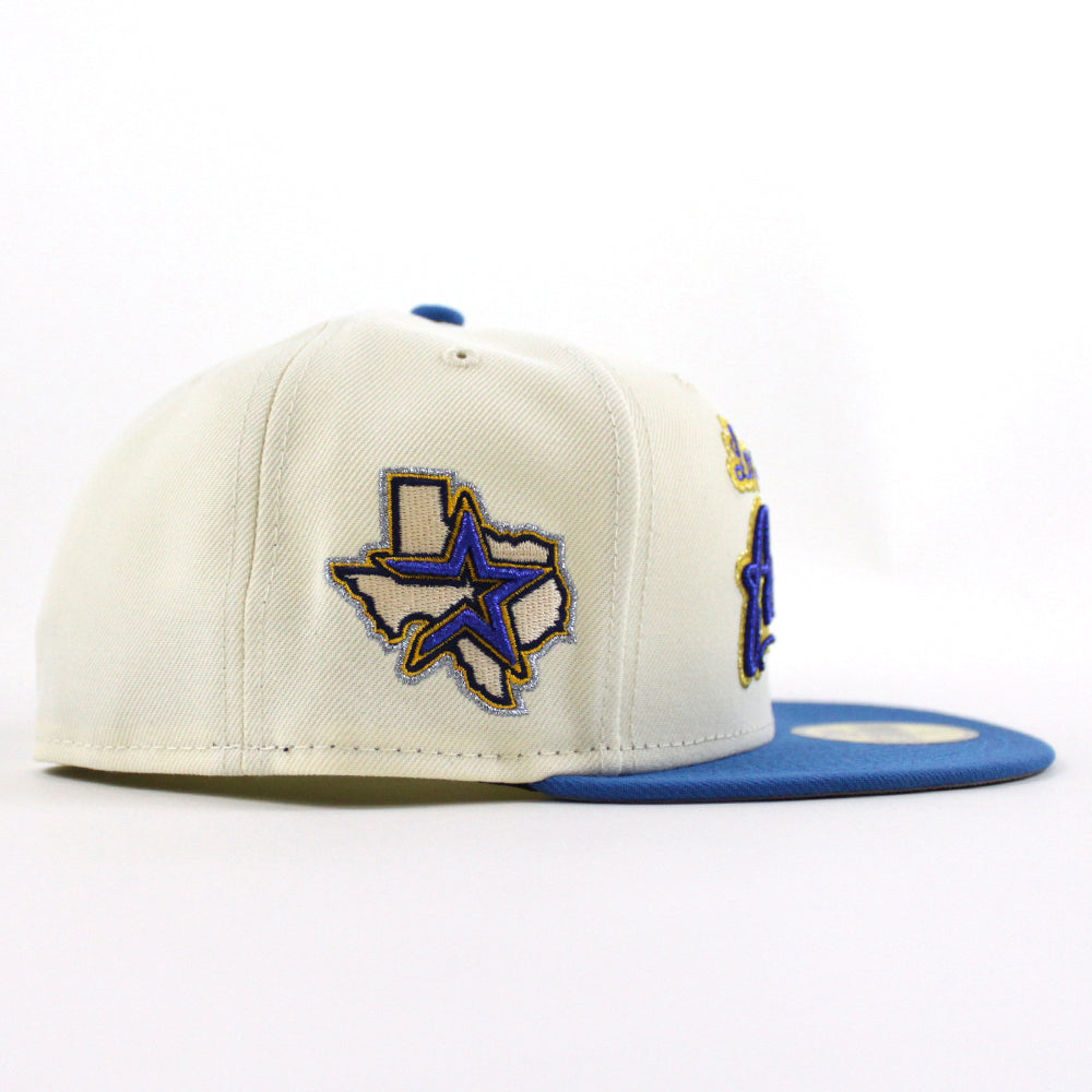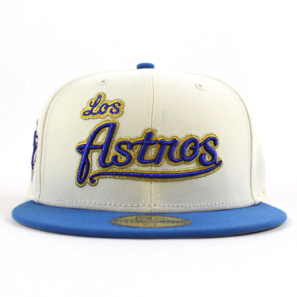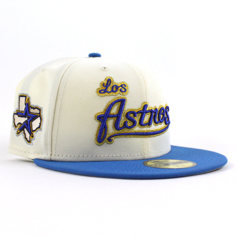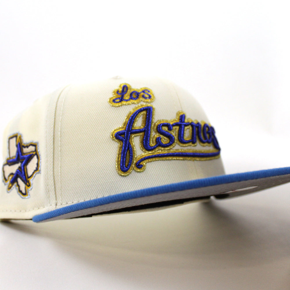 Los Astros Houston Astros City State patch New Era 59Fifty Fitted Hat in Chrome White, Rainstorm Blue and Gray Under Brim. Match to Jordan Laney.