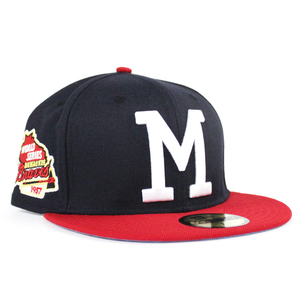 The New Era 59Fifty Fitted Cap featured is the 1957 Milwaukee Braves in their old school team colors of Navy and Red. The Milwaukee Braves New Era 59Fifty Fitted Hat also has a 1957 World Series Side Patch with a Ice Blue Under Brim.