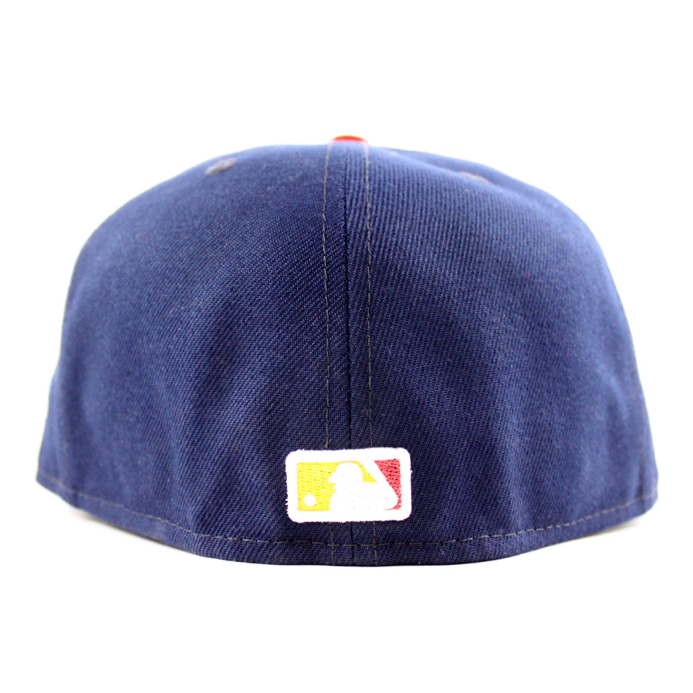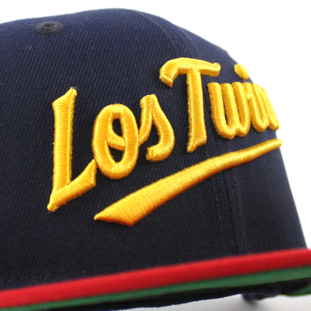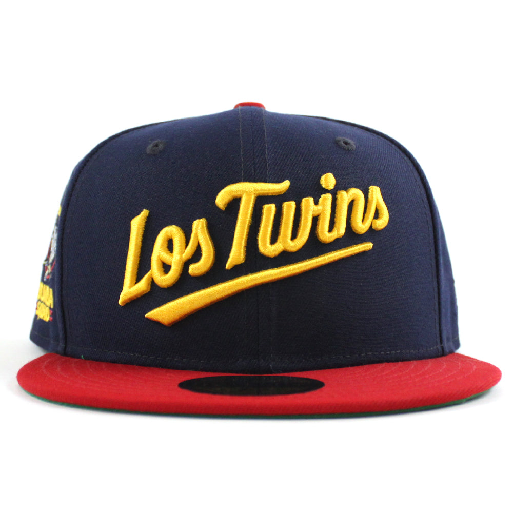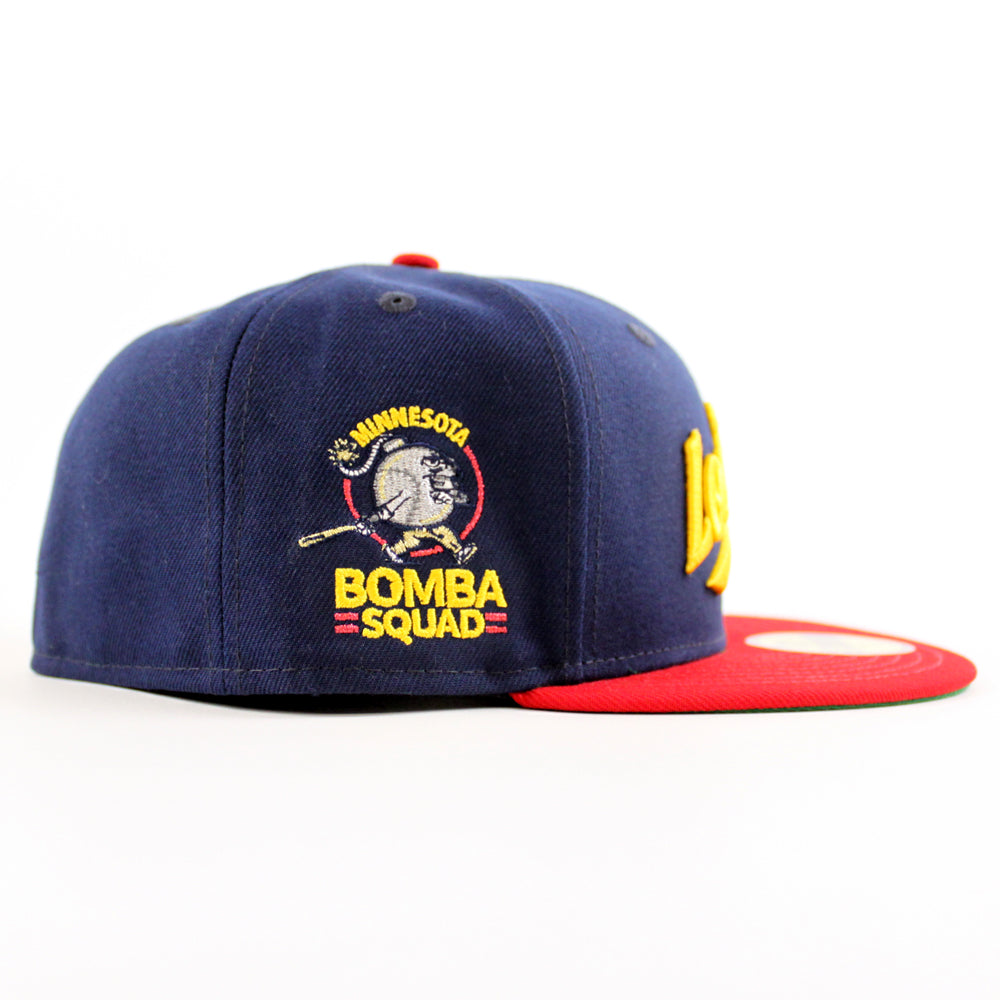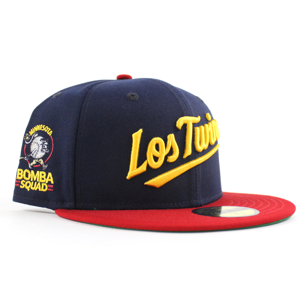 Minnesota Twins (Los Twins) Bomba Squad 59Fifty New Era Fitted Hat in Oceanside Scarlet Green Under Brim.