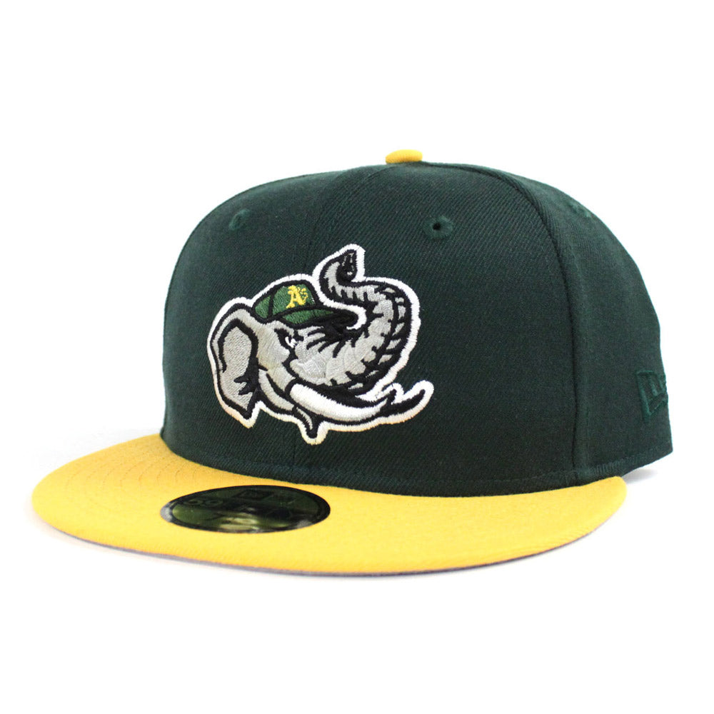 Modesto Athletics New Era 59FIFTY Fitted Hat is Hunter Green based and Yellow on the visor and button. The Modesto Nuts were once none as the Modesto Athletics, They are the current MILB affiliate of the Colorado Rockies.