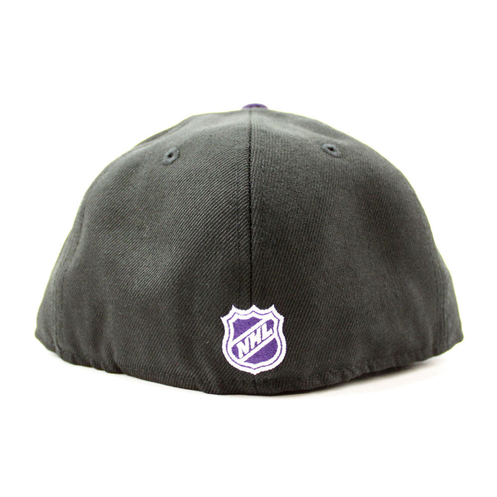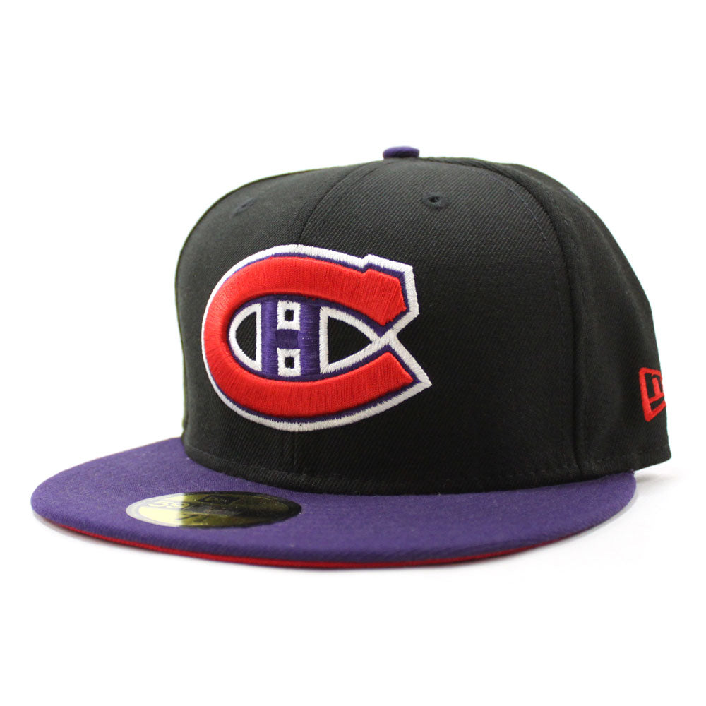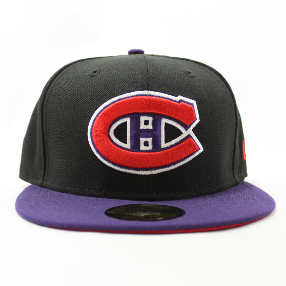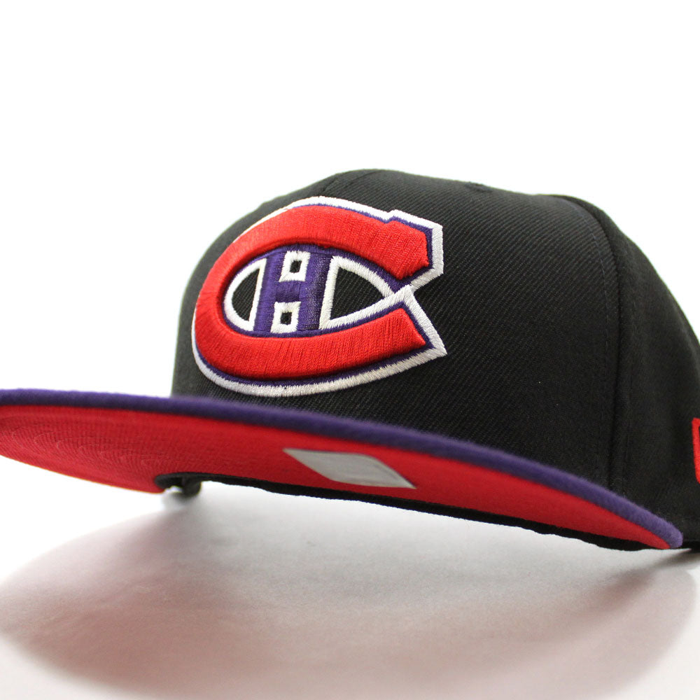 Custom Montreal Candiens New Era 59Fifty fitted hat made in the popular Raptor color way. This Canadiens Fitteds has black crown with a purple brim and red under brim. The logo is red and purple with a white outline.