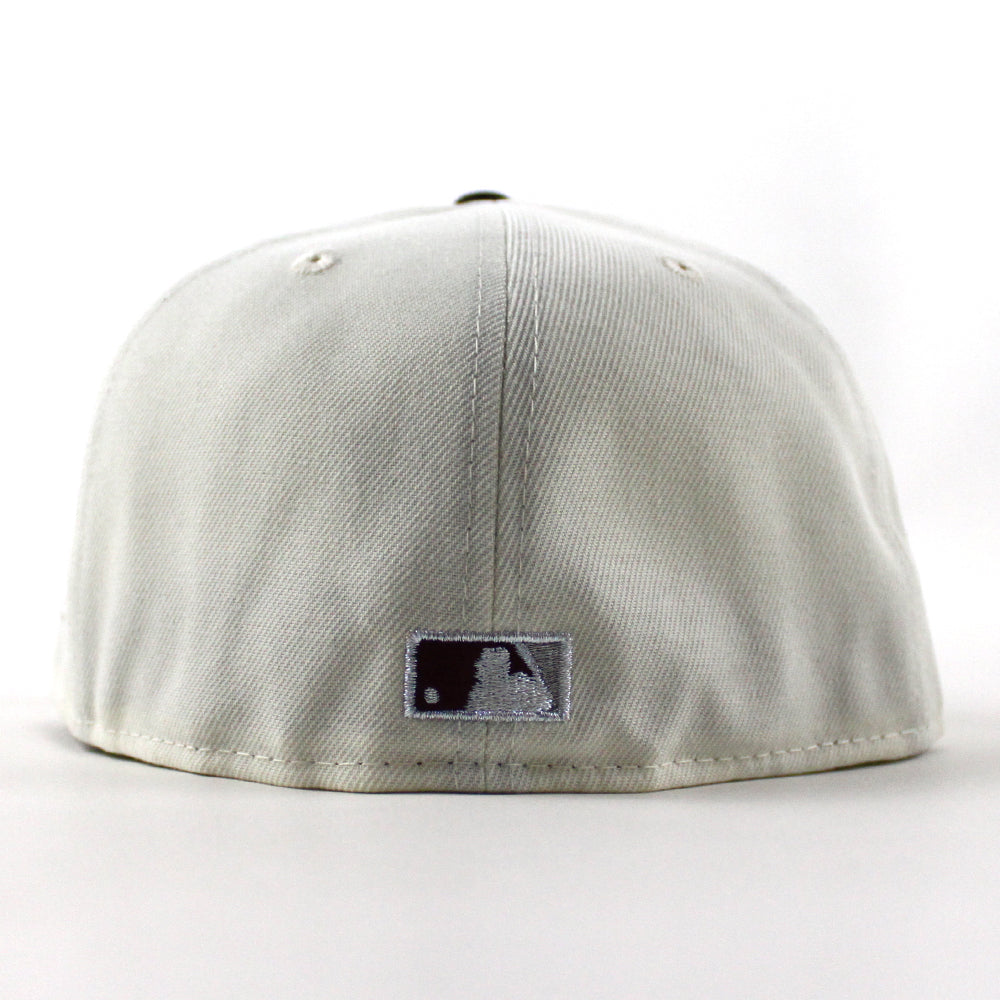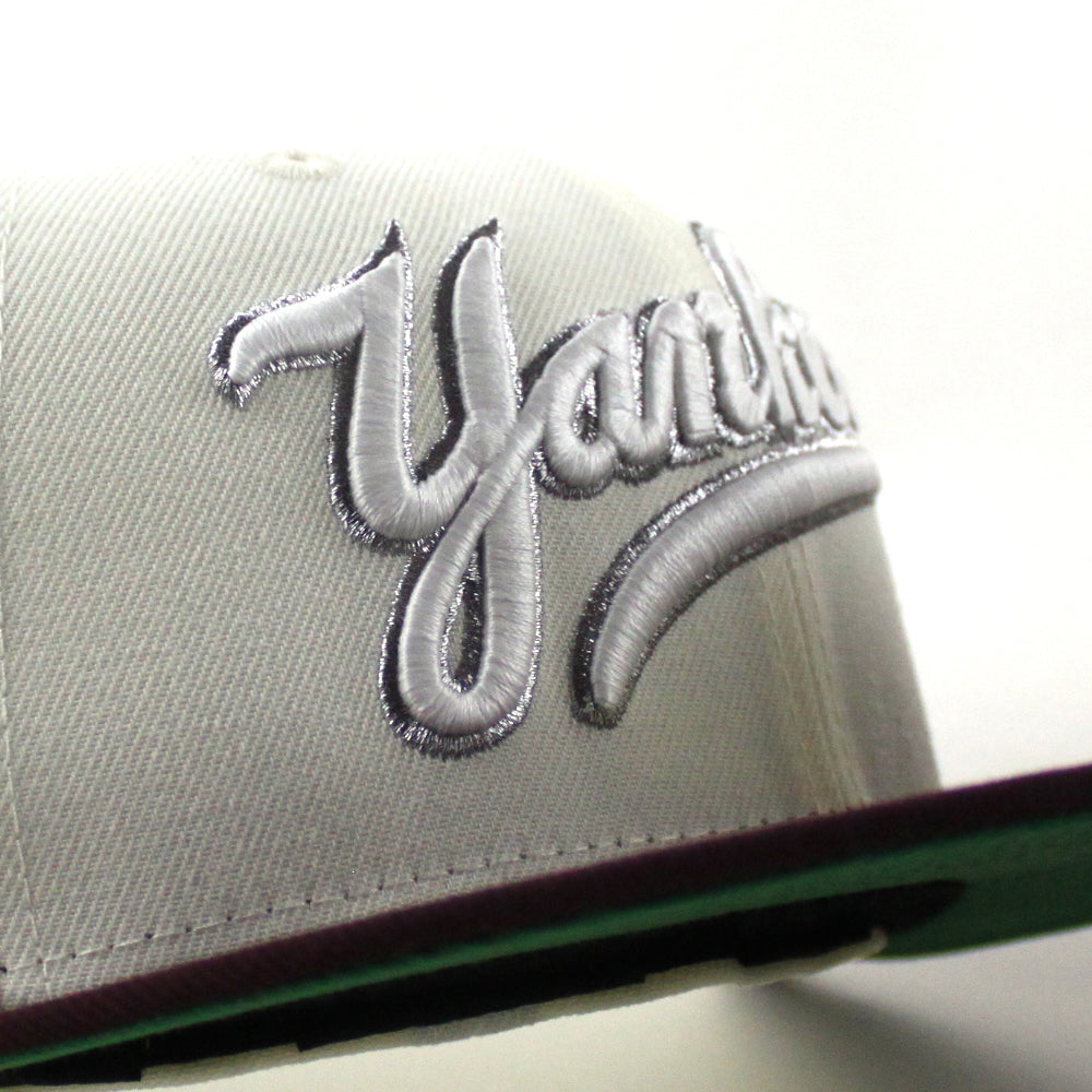 New York Yankees 1999 World Series New Era 59Fifty Fitted Hat in Chrome White, Maroon and Green Under Brim.