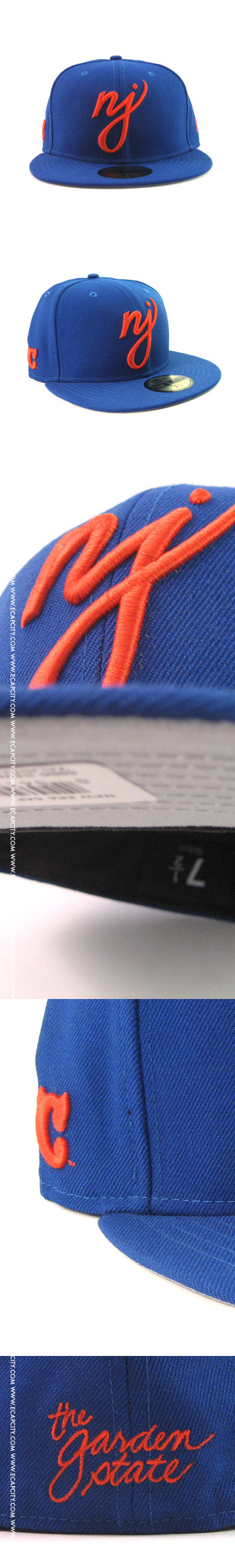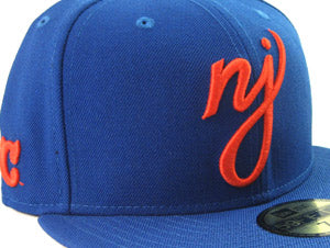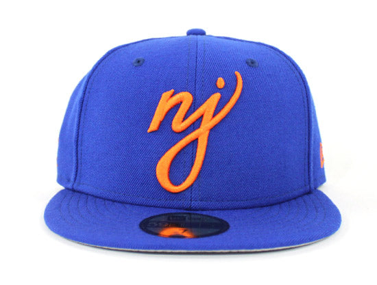 Custom NJ Script logo and New Era 59Fifty Hat designed to pay homage to one of our favorite teams, the New York Mets. This New Jersey 5950New Era Fitted cap is royal blue with an orange logo and a gray under brim.