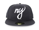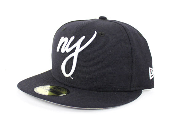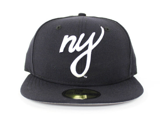 Custom NY Script Logo made by ecapcity. This NY Script New Era 59Fifty Fitted Hat is exclusively available at our retail location and online. The color way on this hat is traditional Navy and white with a gray under Brim. Yankees Color Way.