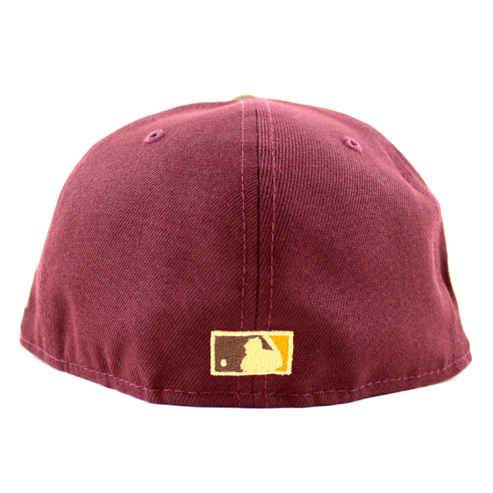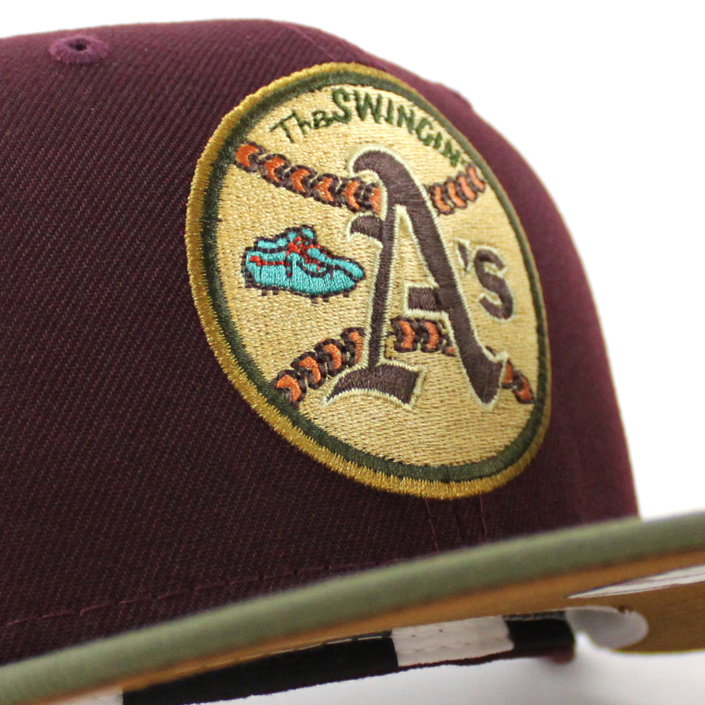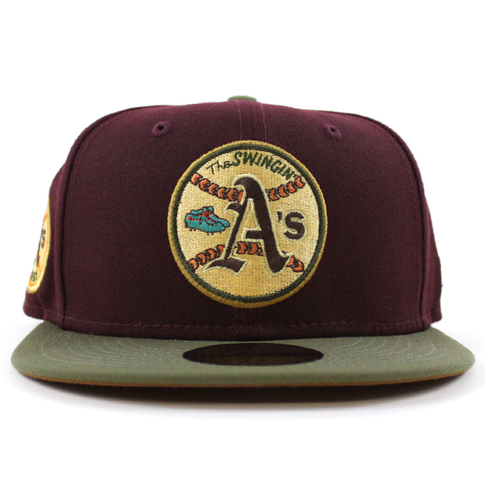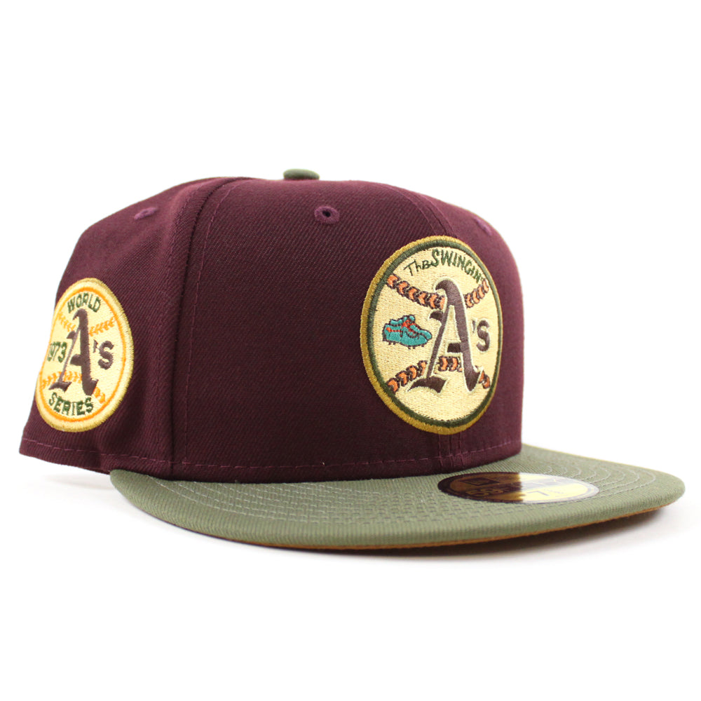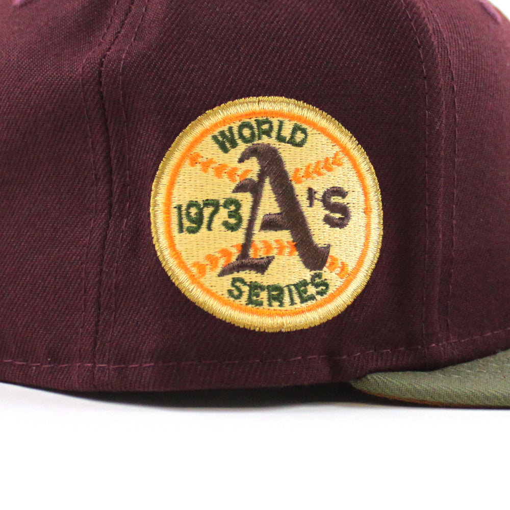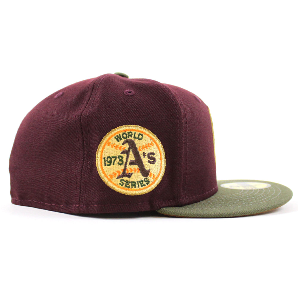Oakland Athletics 1973 World Series New Era 59Fifty Fitted Cap in Maroon, New Olive and Toasted Peanut Under Brim.