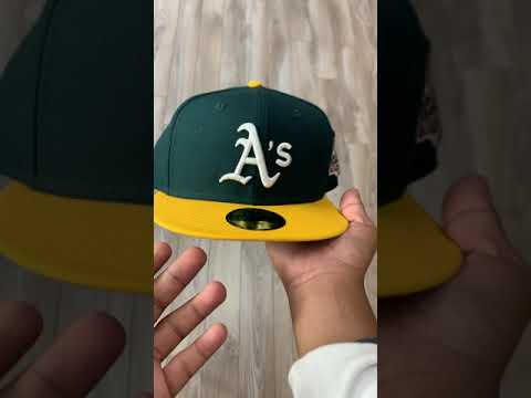 BATTLE OF THE BAY Oakland Athletics 1989 World Series New Era 59Fifty Fitted Hat in Green, Yellow & Gray Under Brim.