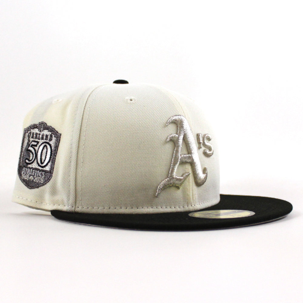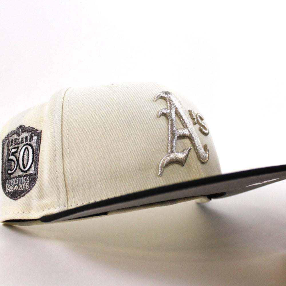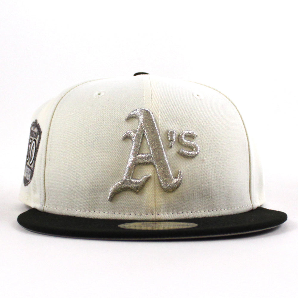 Oakland Athletics 50th Anniversary New Era 59Fifty Fitted Hat in Chrome White, Black with Gray Under Brim.