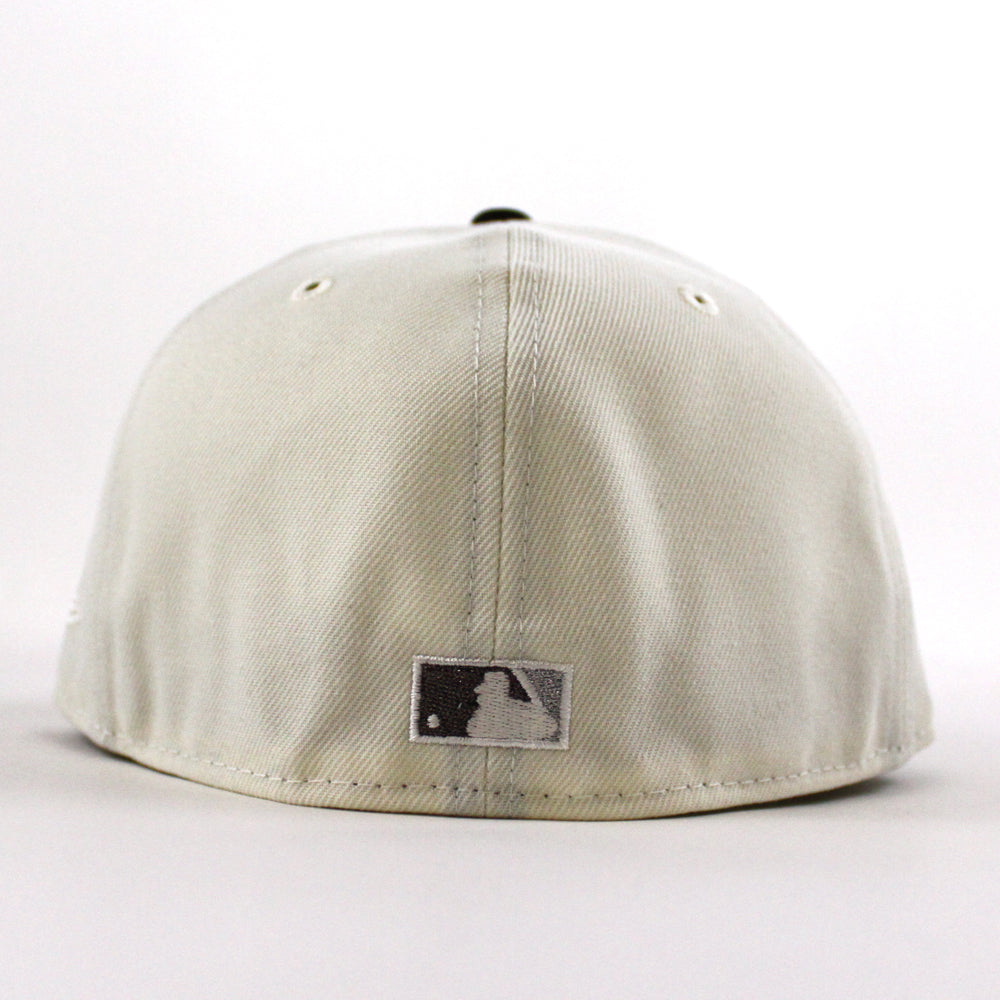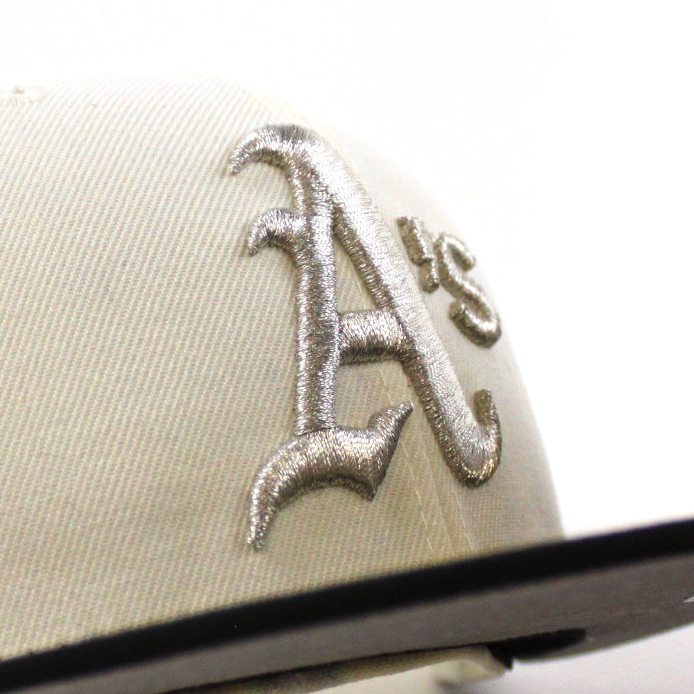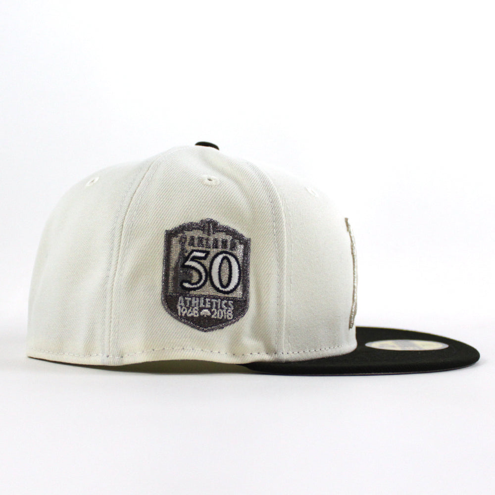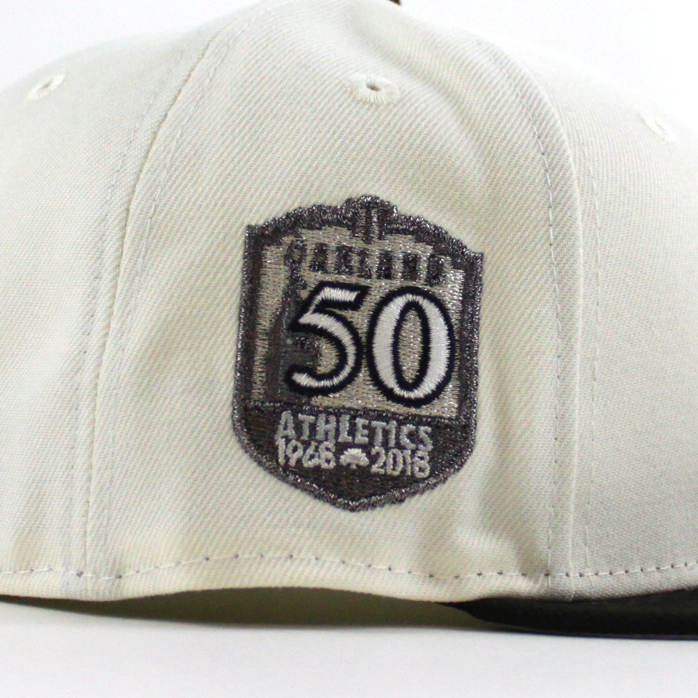 Oakland Athletics 50th Anniversary New Era 59Fifty Fitted Hat in Chrome White, Black with Gray Under Brim.