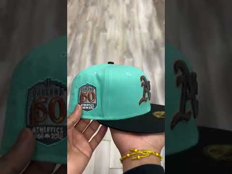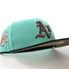 Oakland Athletics 50th Anniversary New Era 59Fifty Fitted Hat in Mint with Black visor & Khaki Under Brim.
