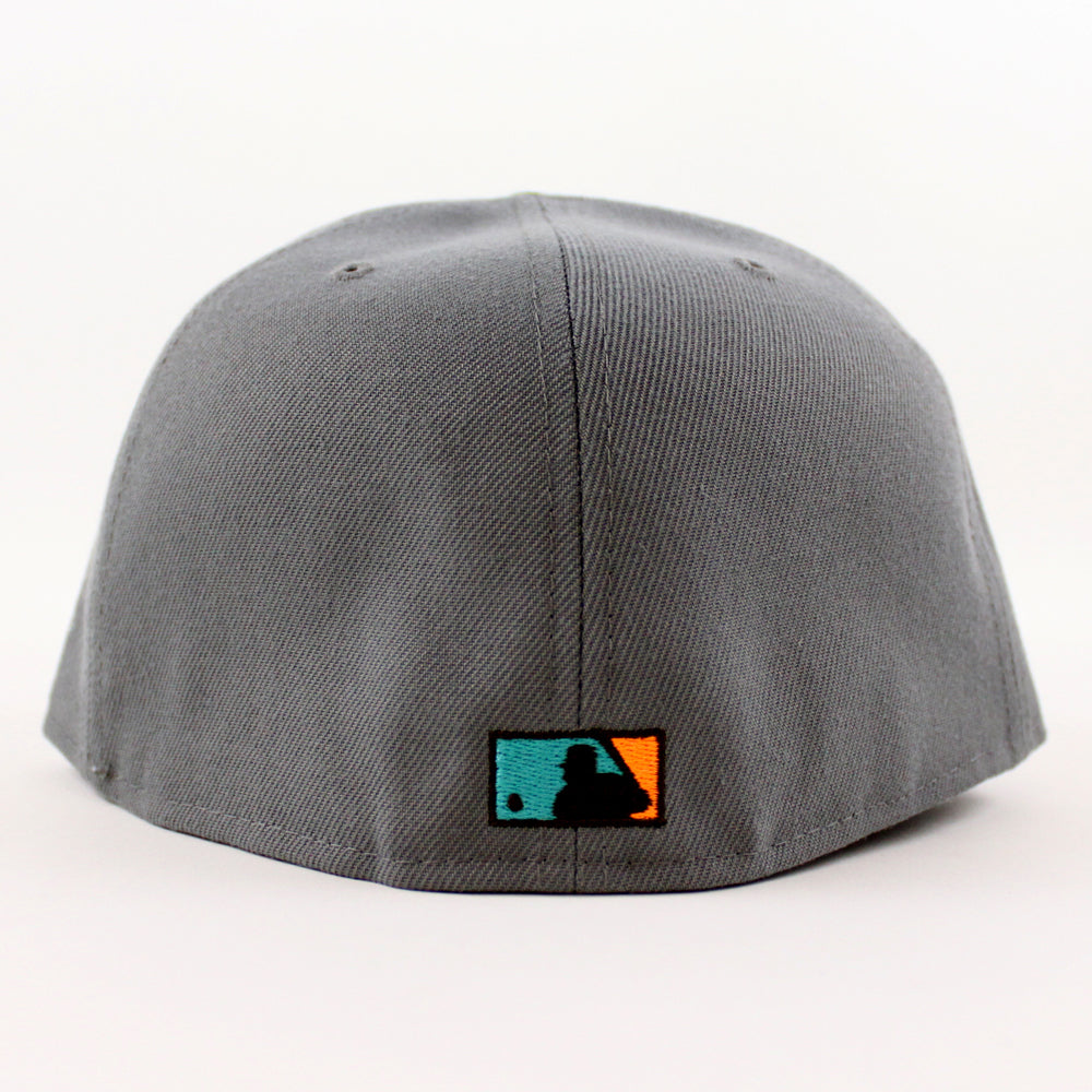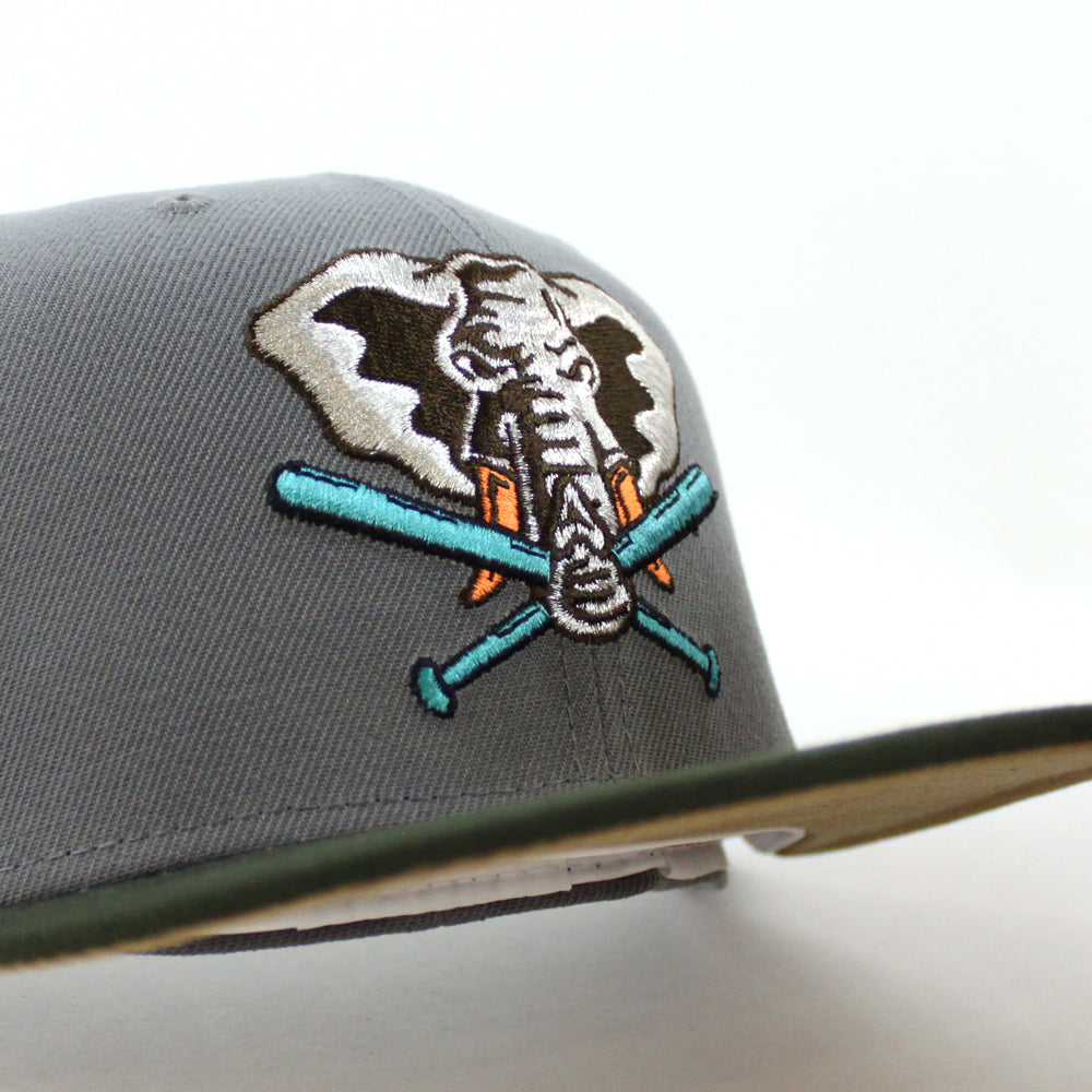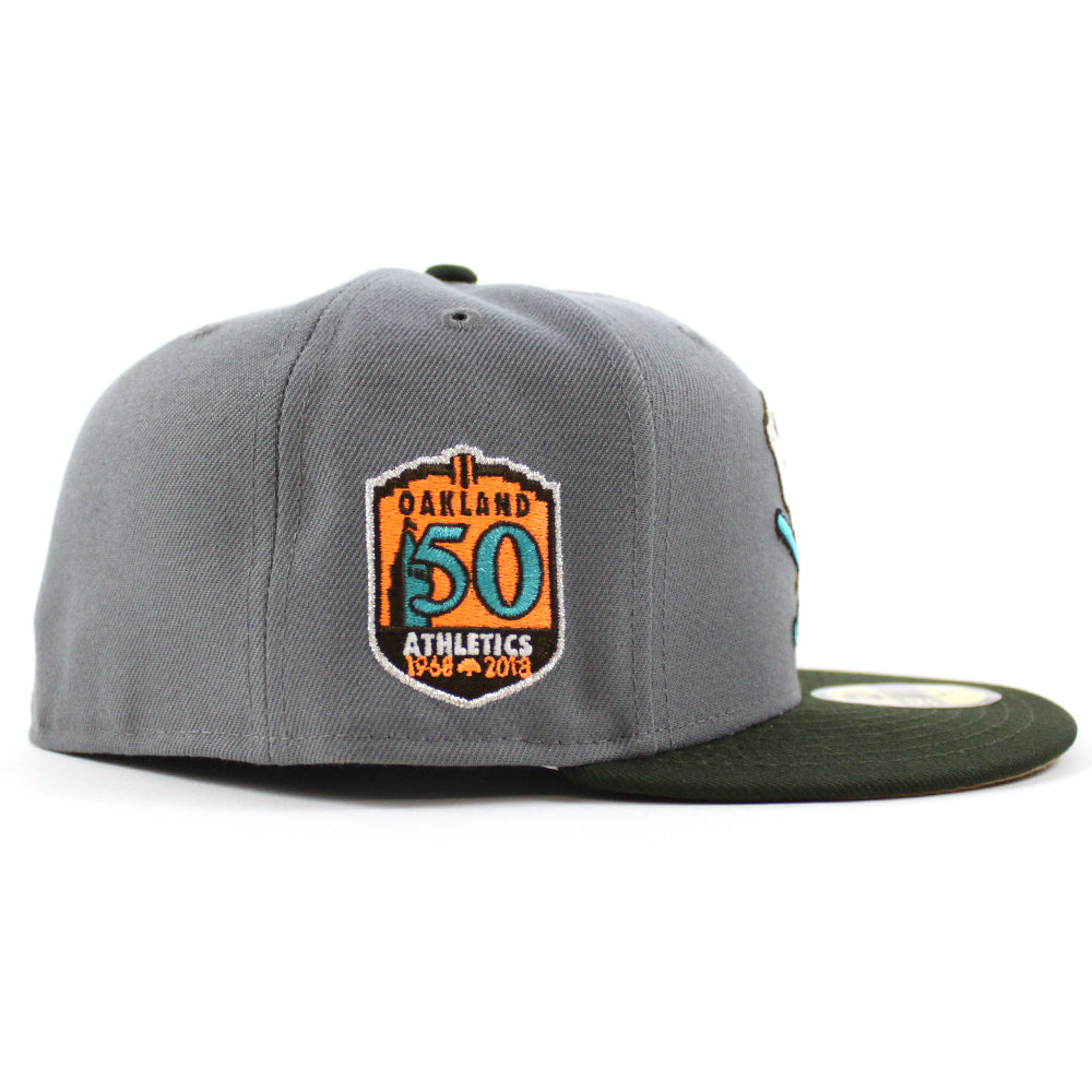 Oakland Athletics 50TH Anniversary New Era 59Fifty Fitted Hat in Storm Gray, Dark Green with Khaki Under Brim.