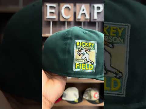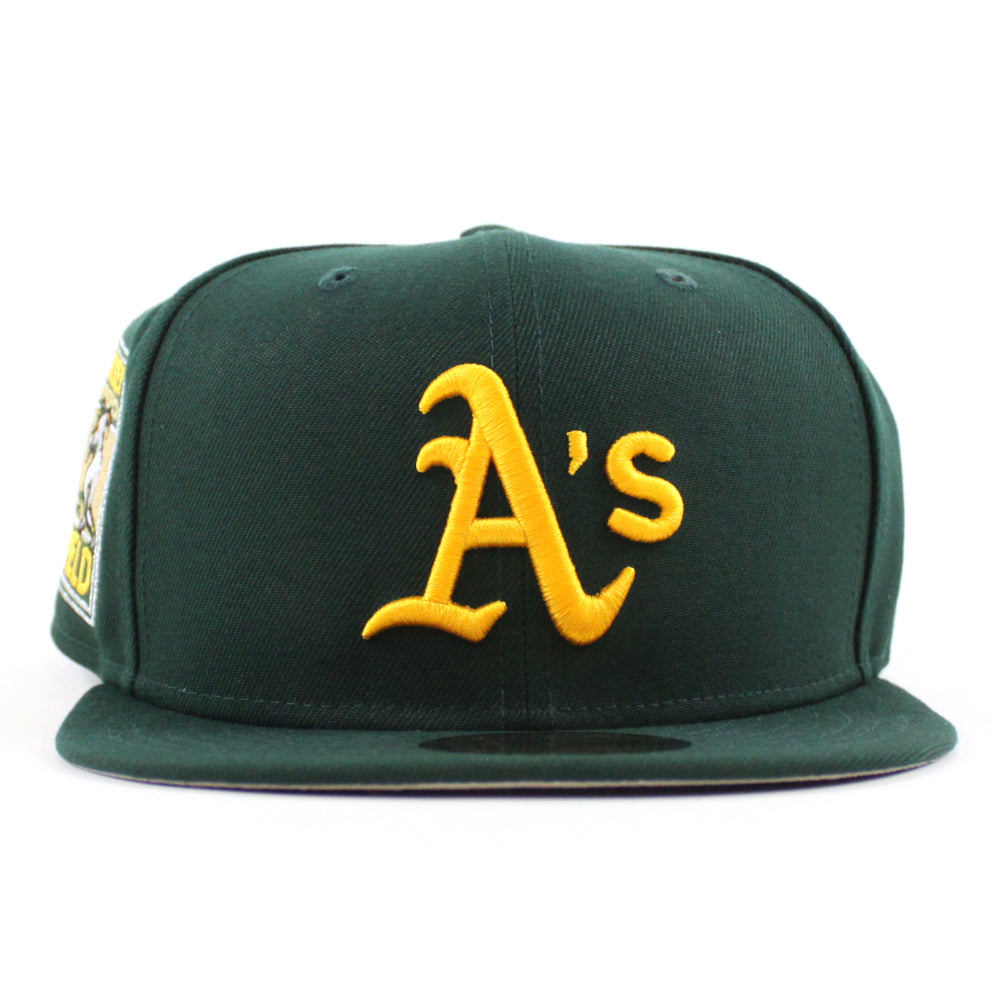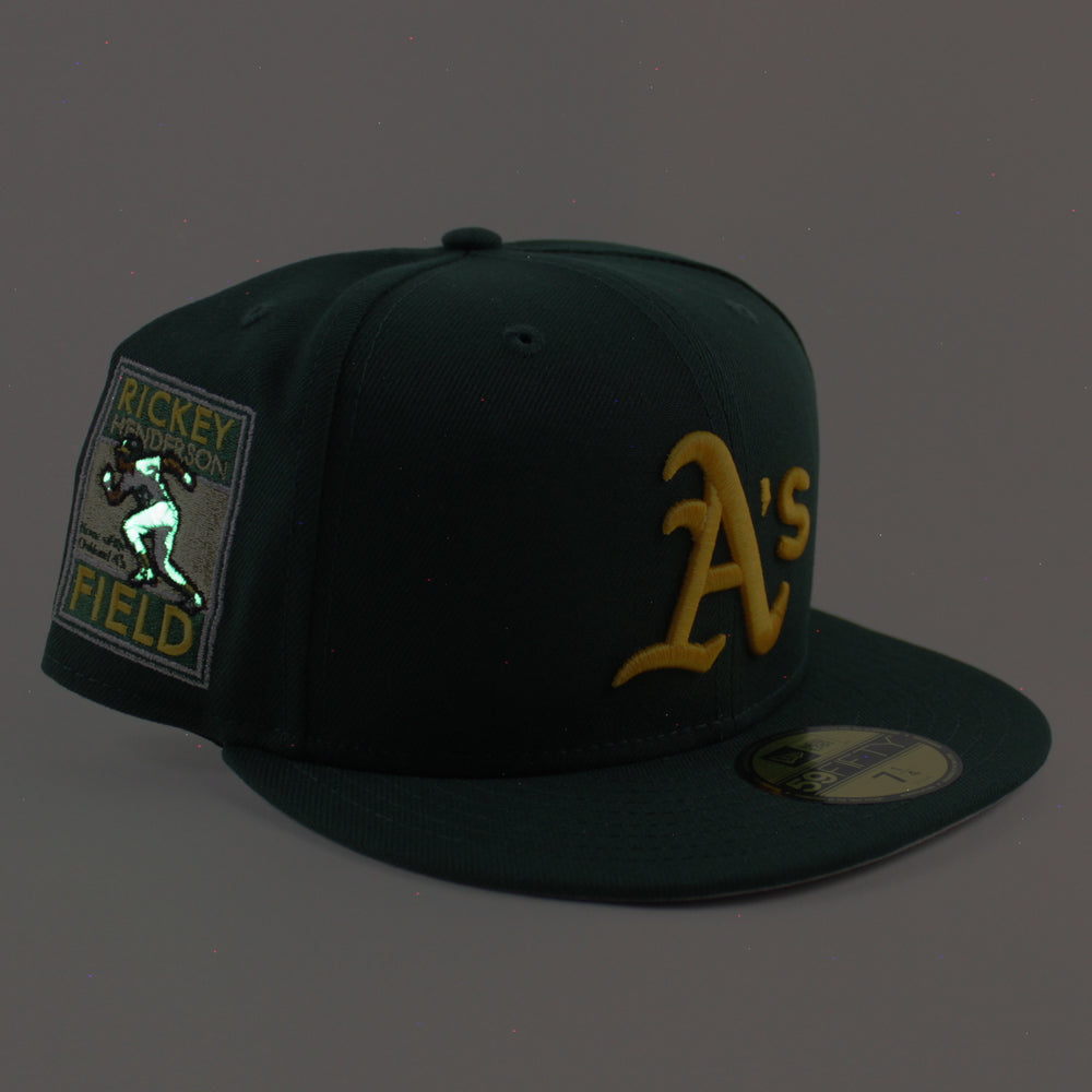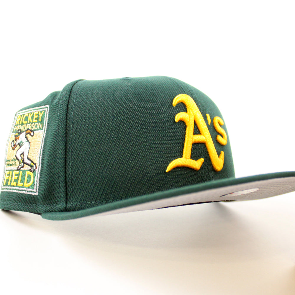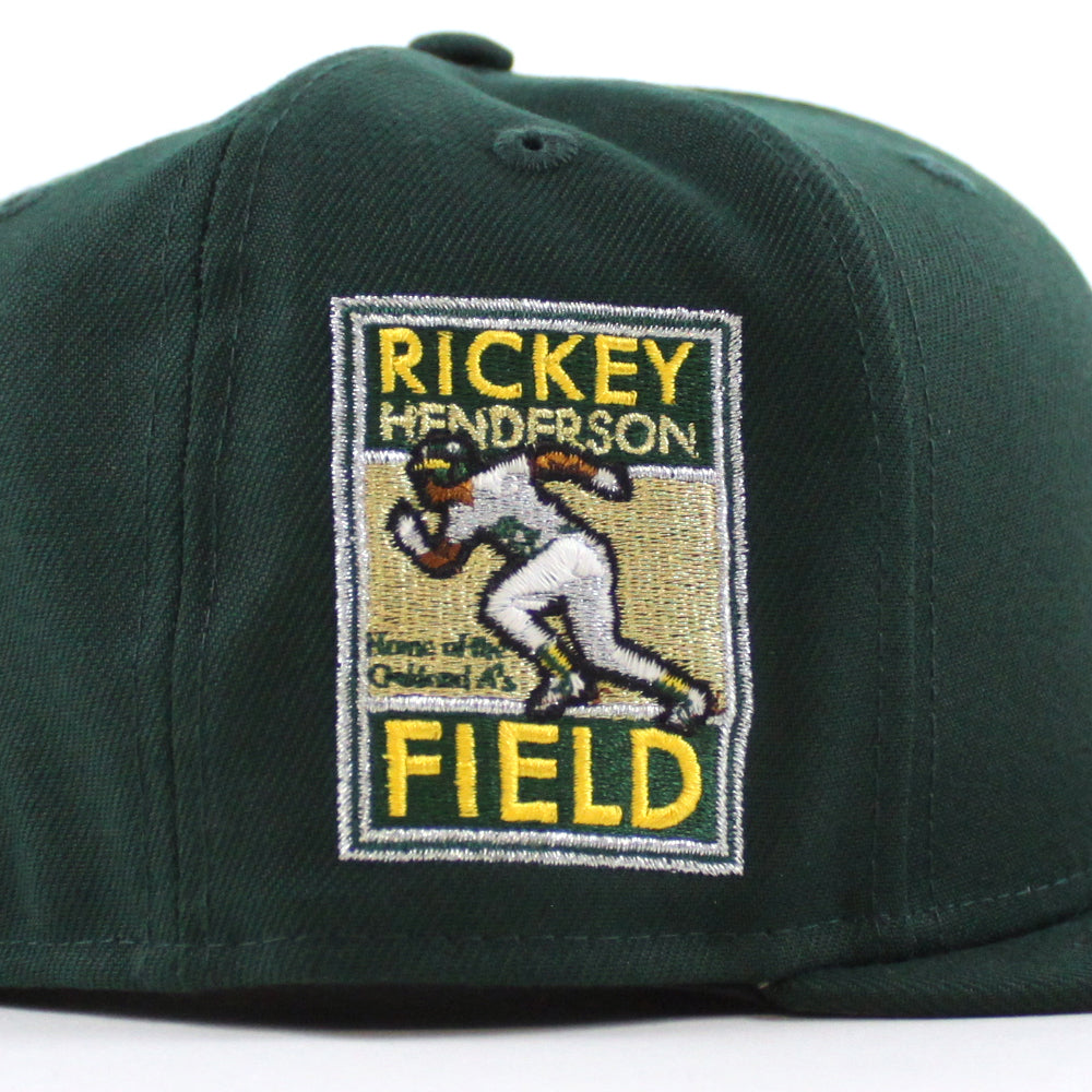 Oakland Athletics Rickey Henderson Oakland Patch New Era 59Fifty Fitted Hat in Dark Green and Gray Under Brim.