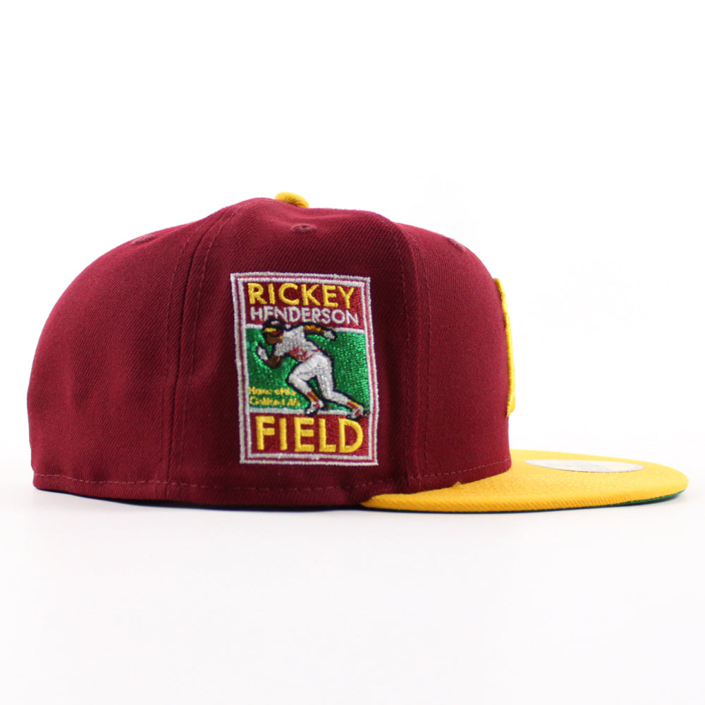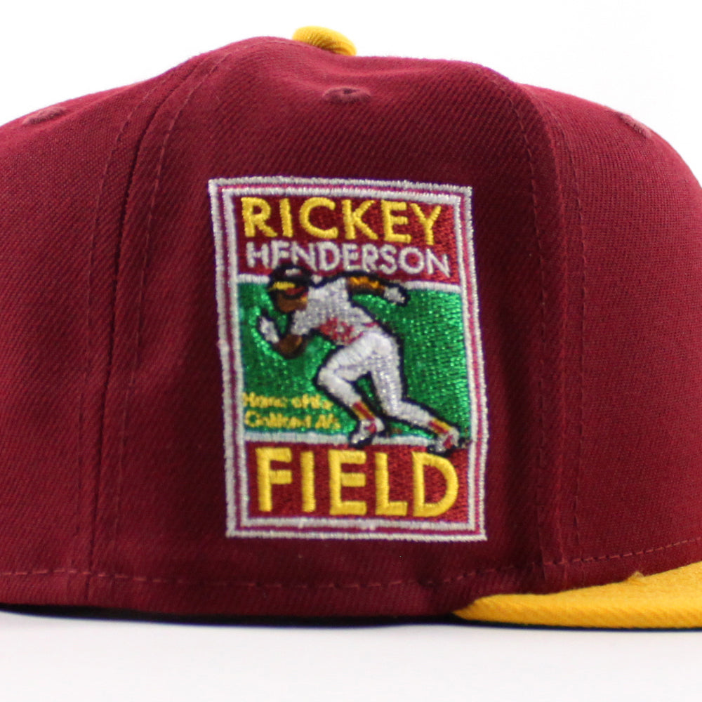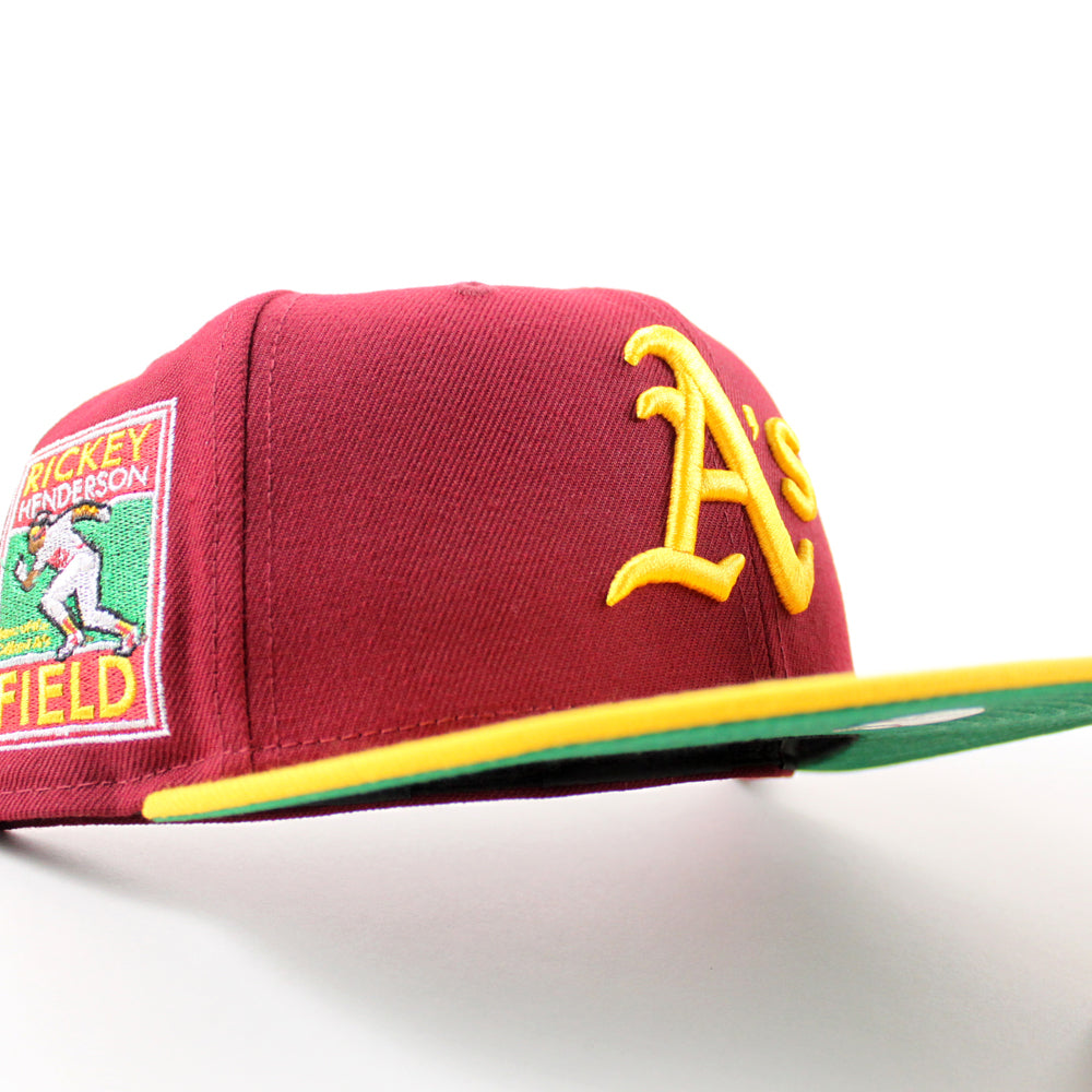 Oakland Athletics Ricky Henderson New Era 59Fifty Fitted Hat in Cardinal Red, Gold and Green Under Brim.