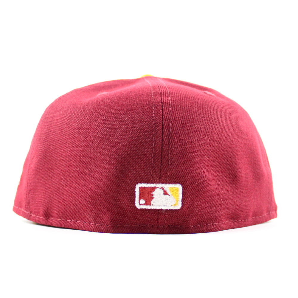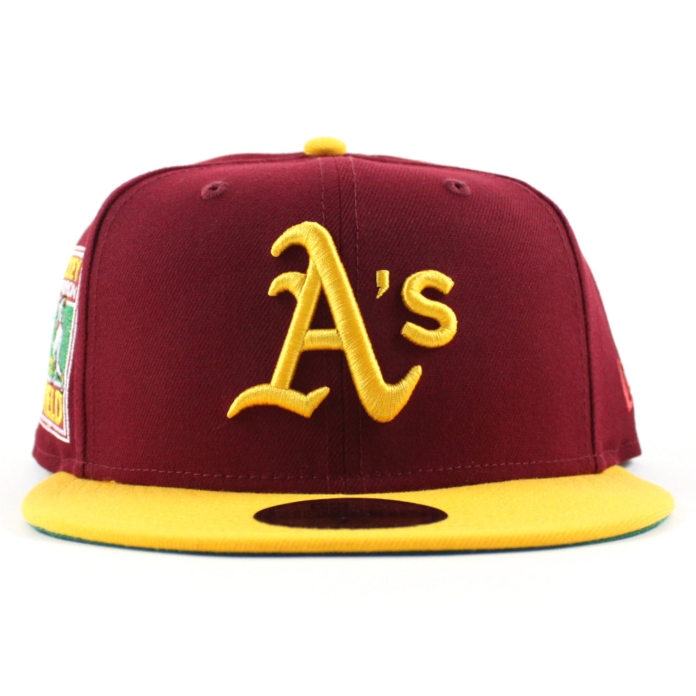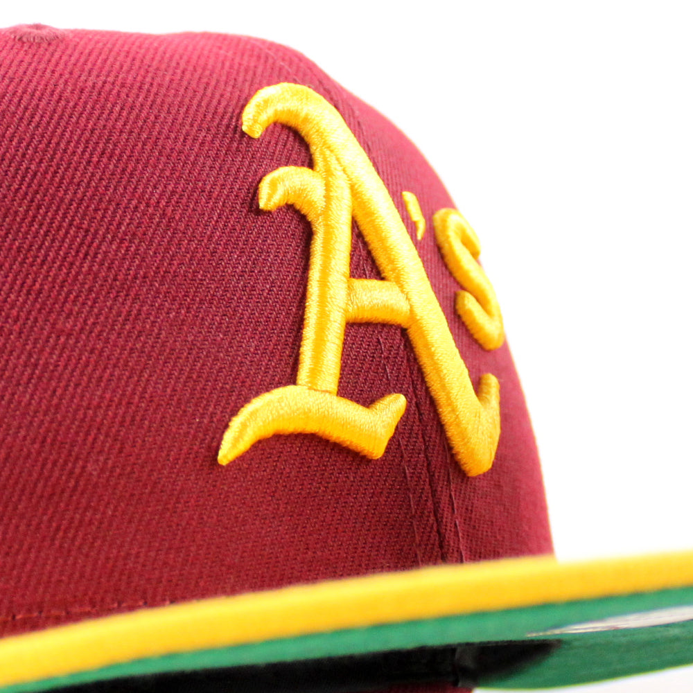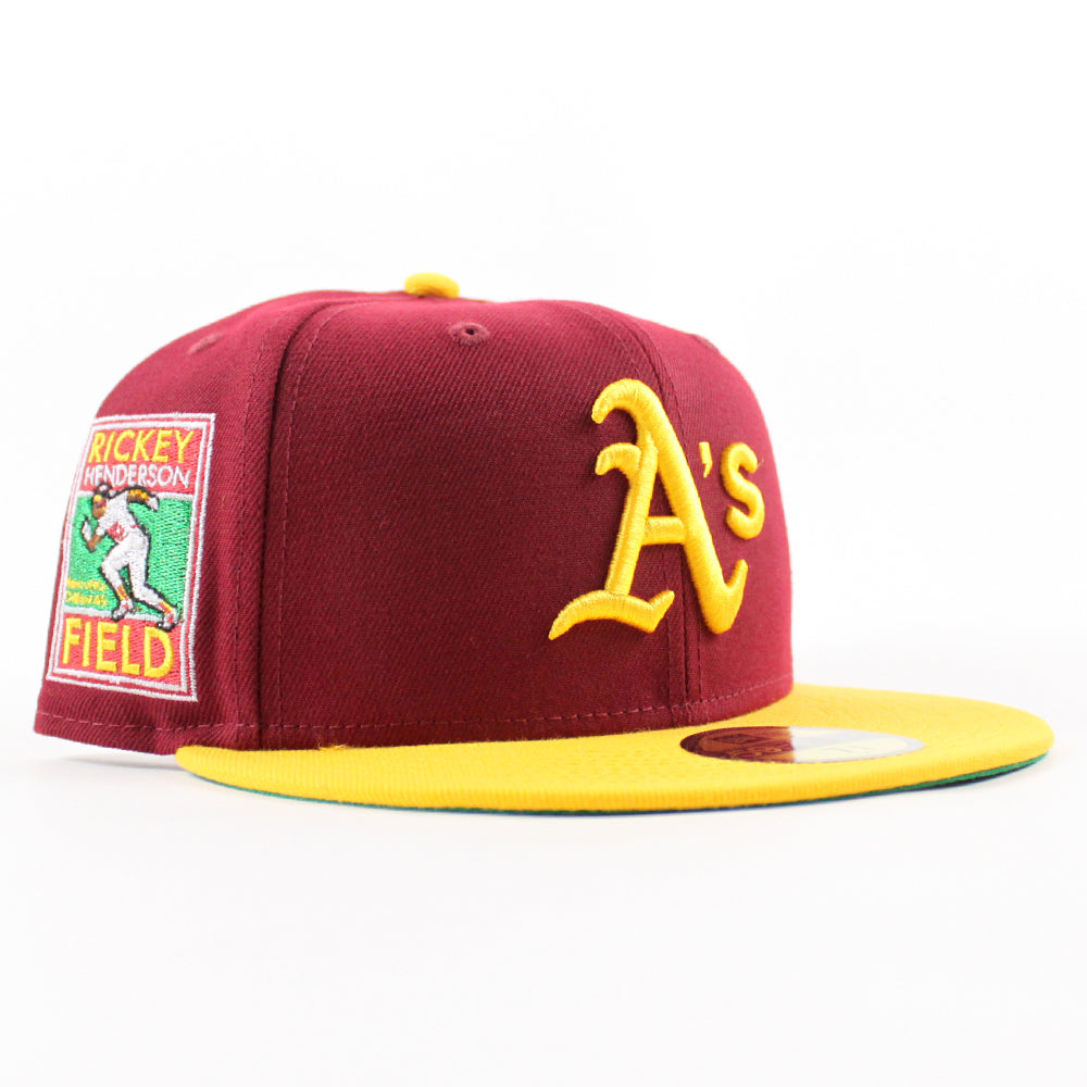 Oakland Athletics Ricky Henderson New Era 59Fifty Fitted Hat in Cardinal Red, Gold and Green Under Brim.