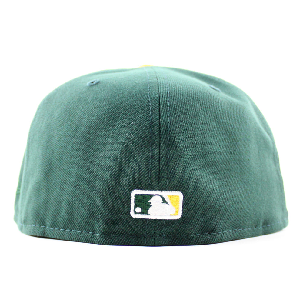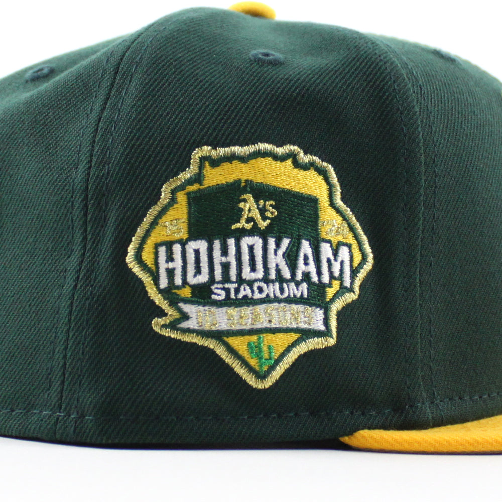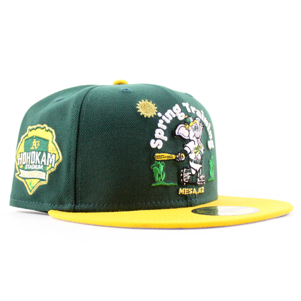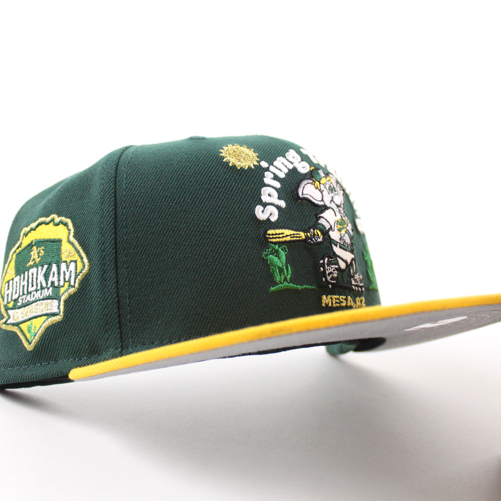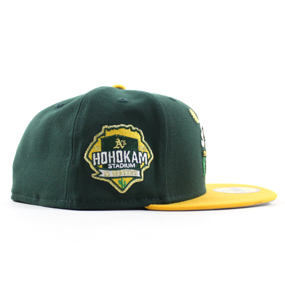Oakland Athletics Spring Training Hohokam Stadium New Era 59Fifty Fitted Hat in Dark Green, Yellow and Gray Under Brim.