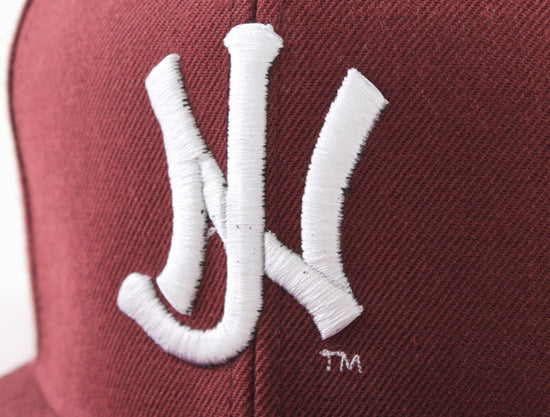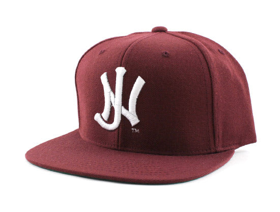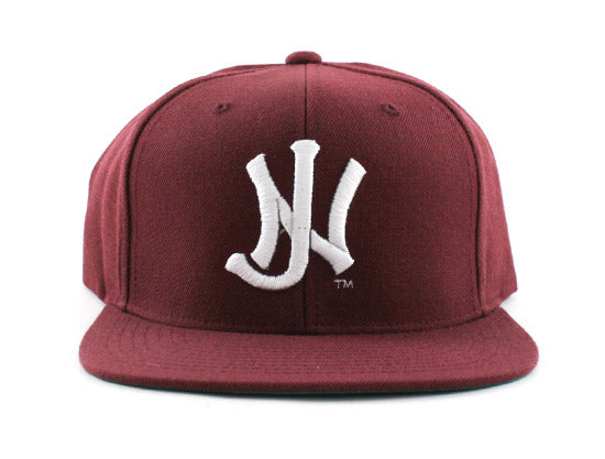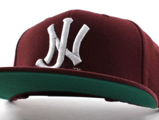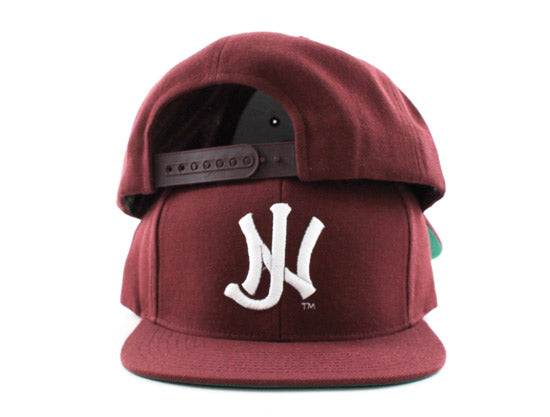 Old School NJ Snapback Hats in Maroon and White with a Green Under Brim.