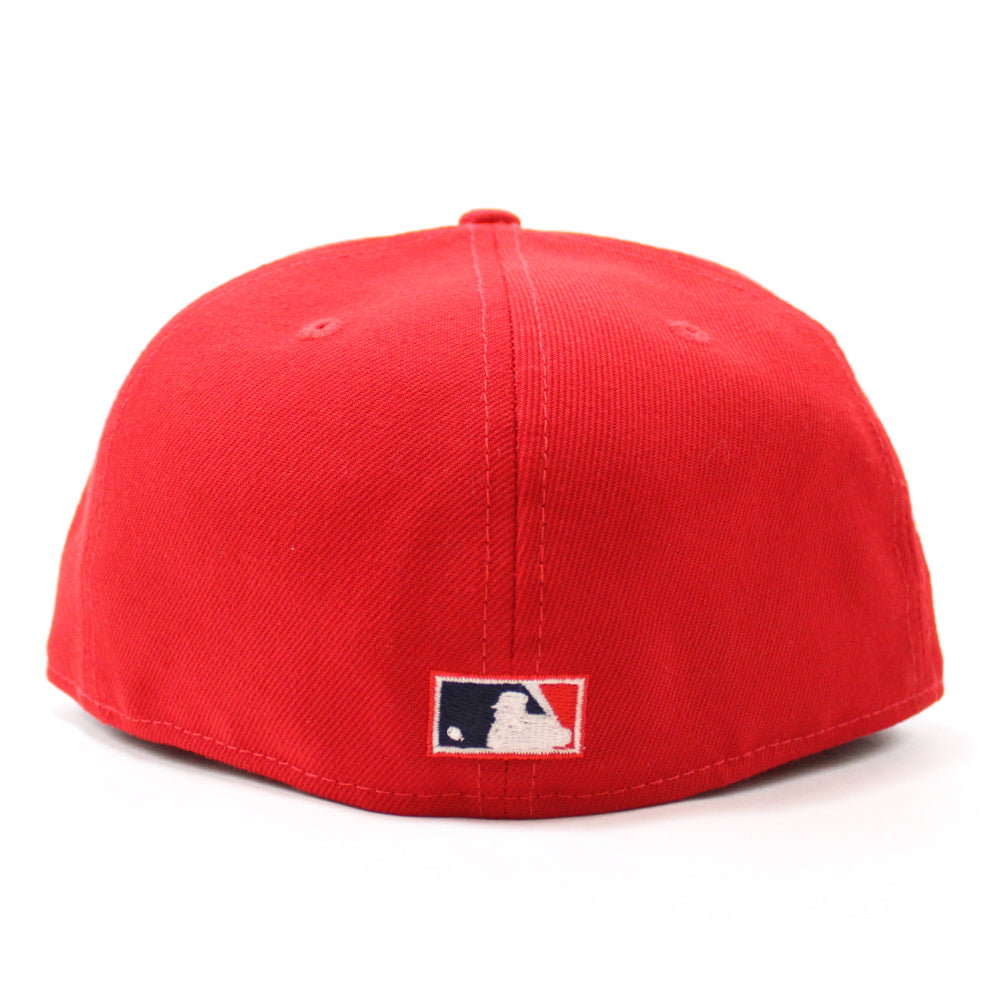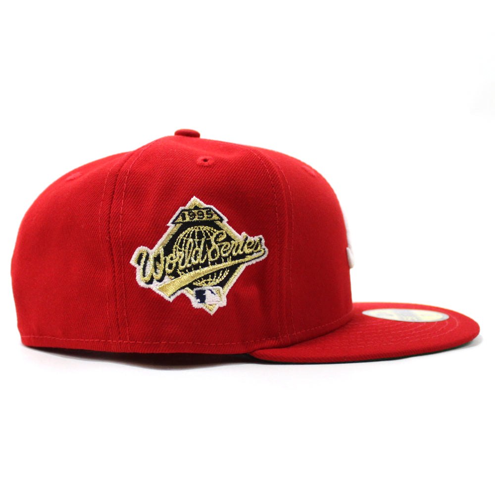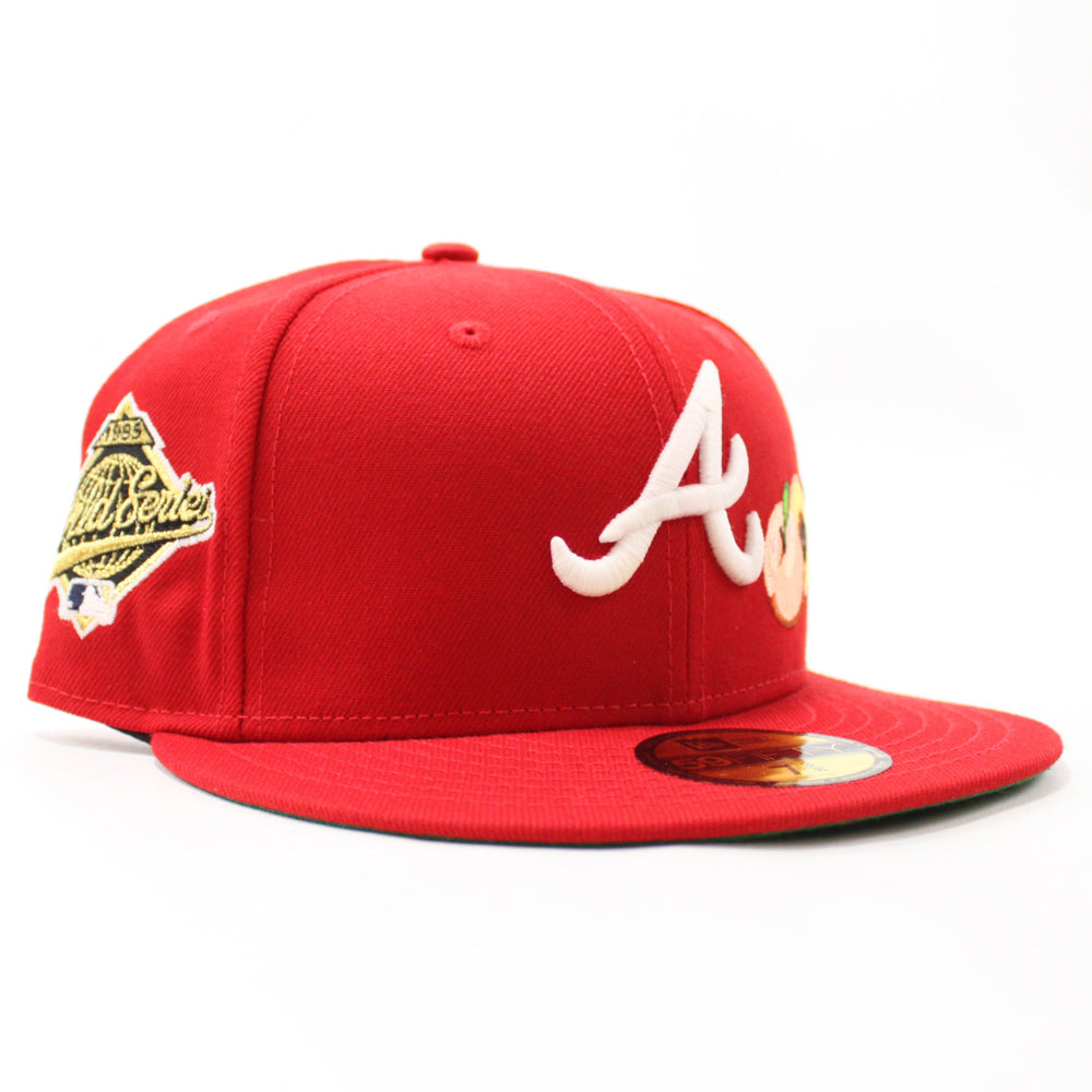Peach Atlanta Braves 1995 World Series New Era 59Fifty Fitted Hat in Navy and Red, with a Grey Under Brim.
