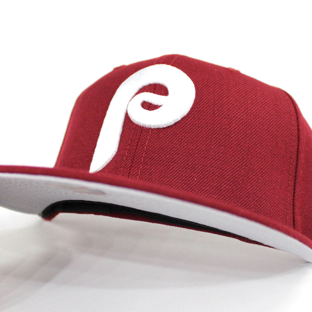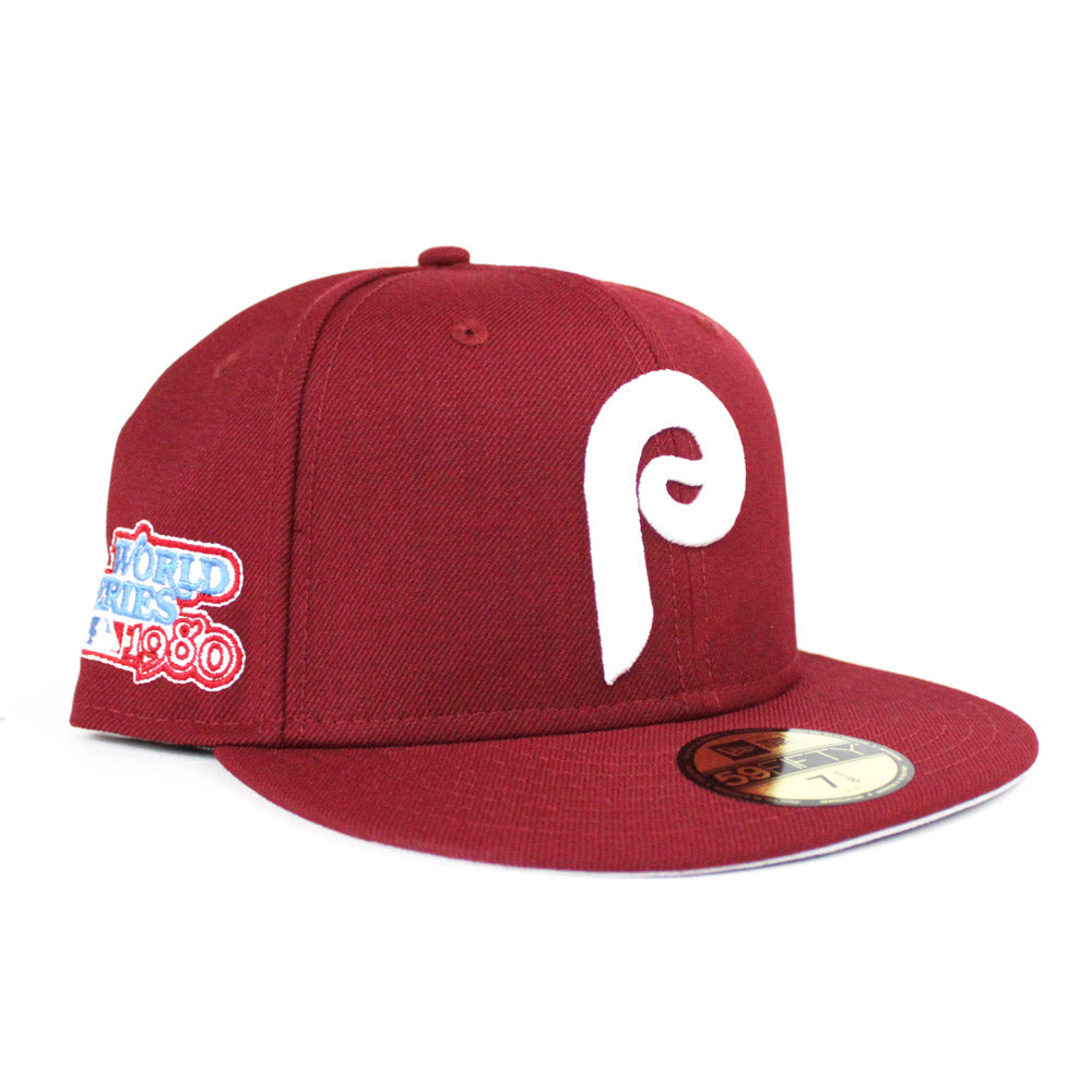 This Retro Philadelphia Phillies 1980 World Series New Era 59Fifty Fitted Hat is always a huge hit here at ecapcity.com. It is so simple and clean you cant go wrong. This Phillies New Era Fitted Cap is Cardinal with a white logo and Gray Under Brim.