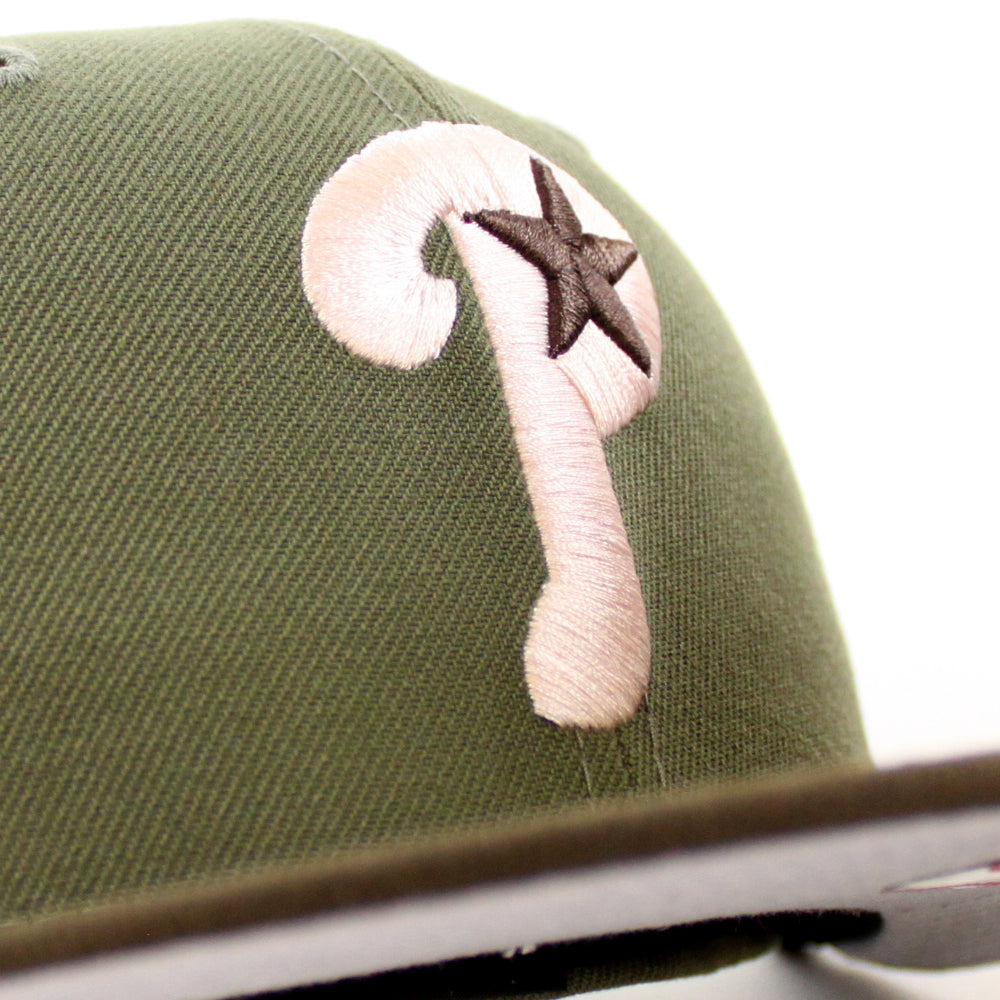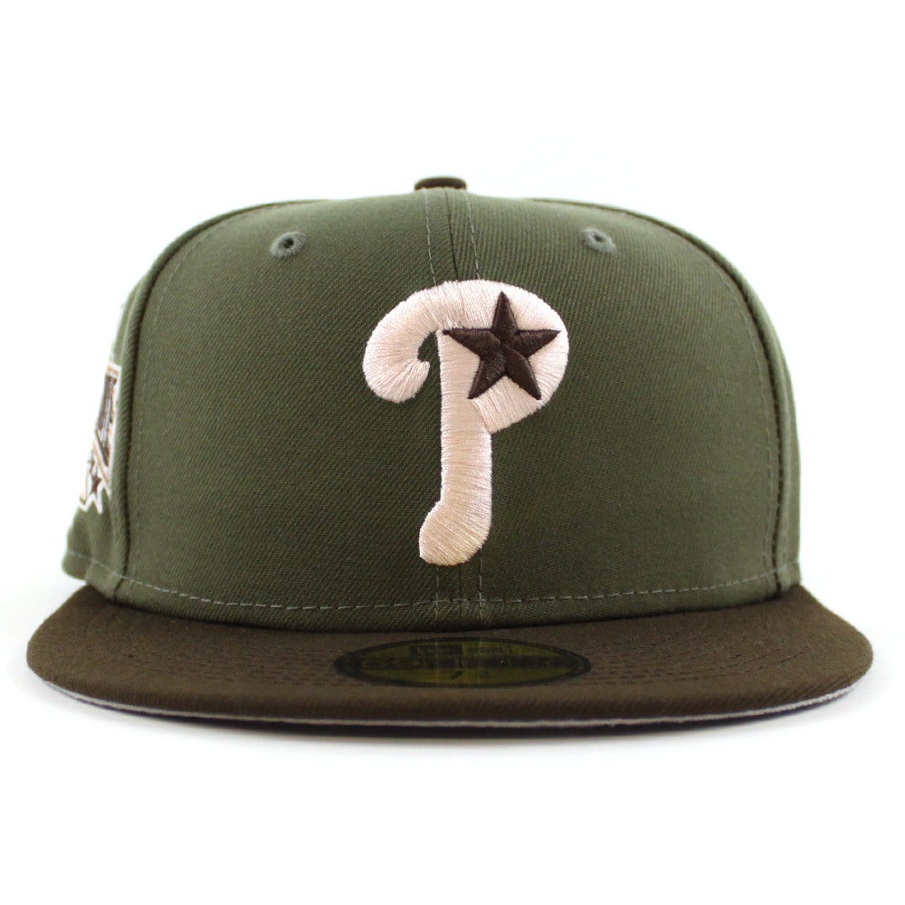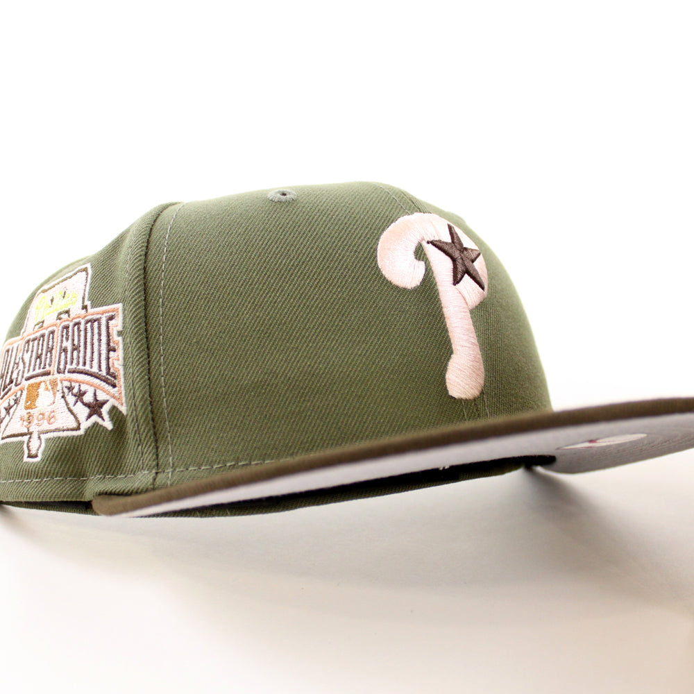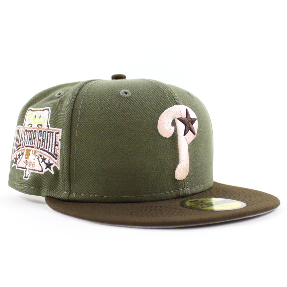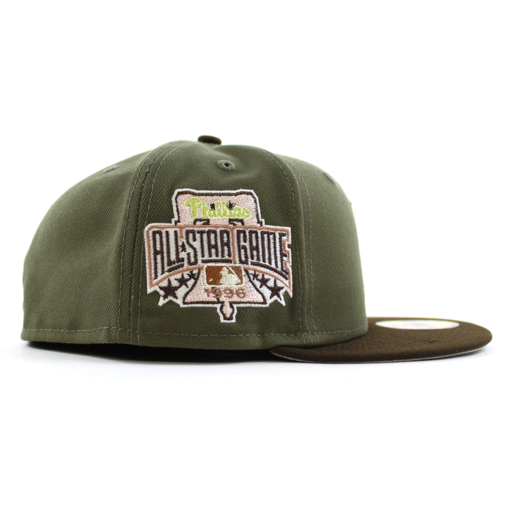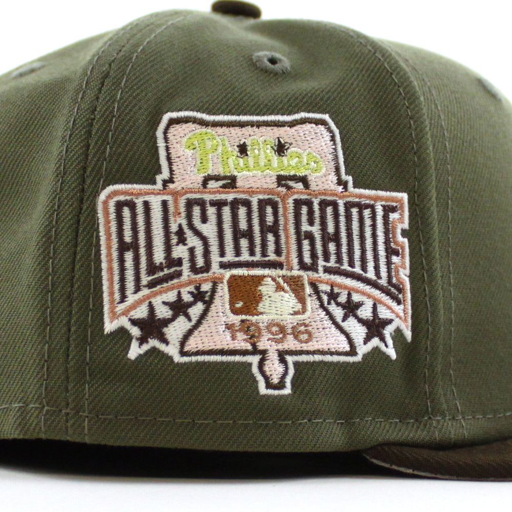 Philadelphia Phillies 1996 All Star Game 59Fifty New Era Fitted Hat in Olive, Brown & Gray Under Brim.