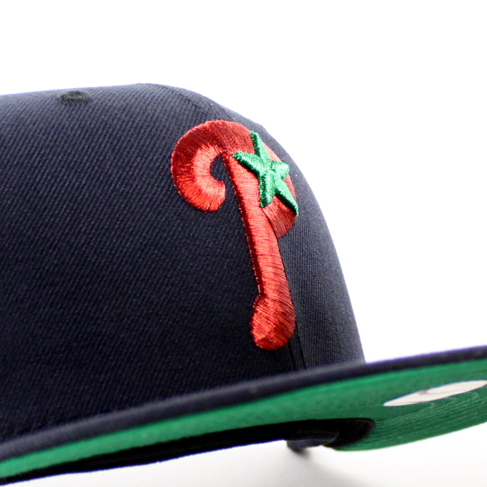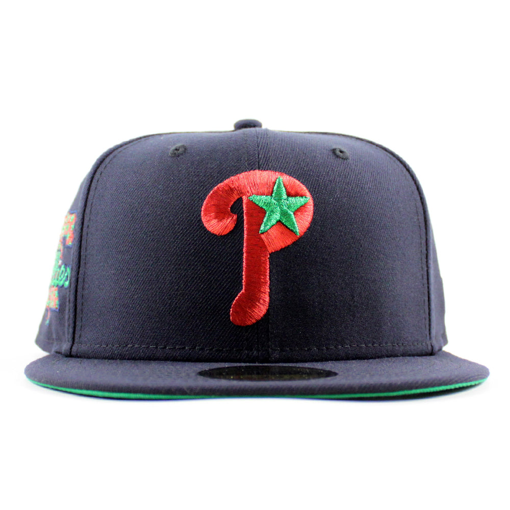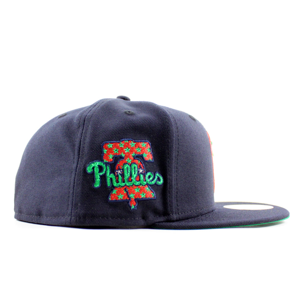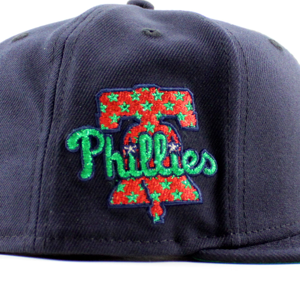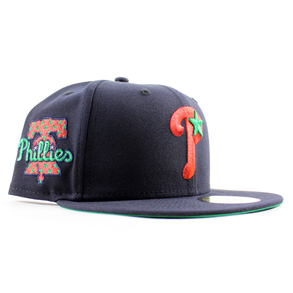 Philadelphia Phillies Liberty Bell Patch 59Fifty New Era Fitted Hat in Navy and Green Under Brim.