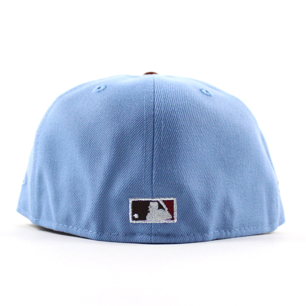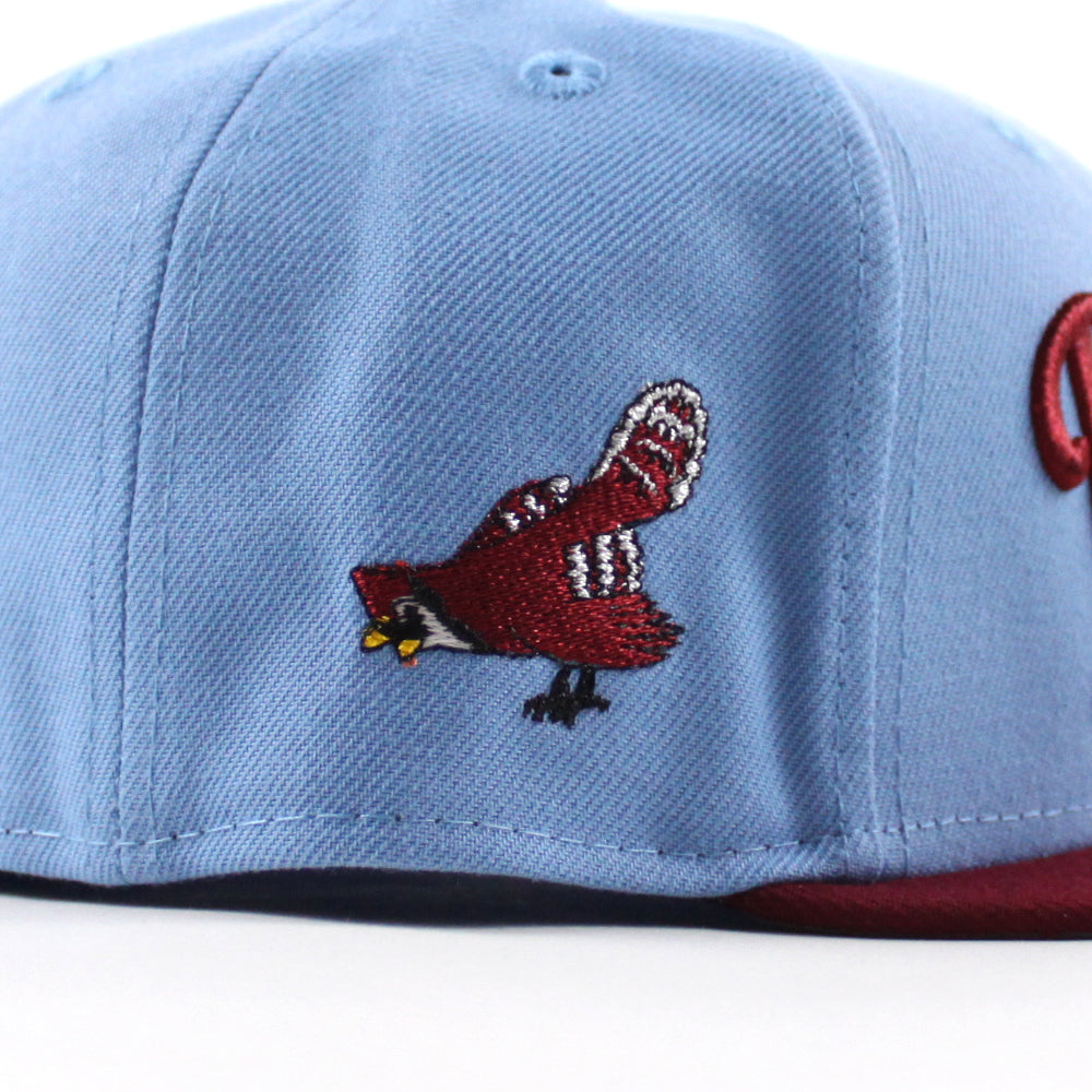 Philadelphia Phillies Philly Phanatic 59Fifty New Era Fitted Hat in Sky Blue and Cardinal Red With a Gray Under Brim.