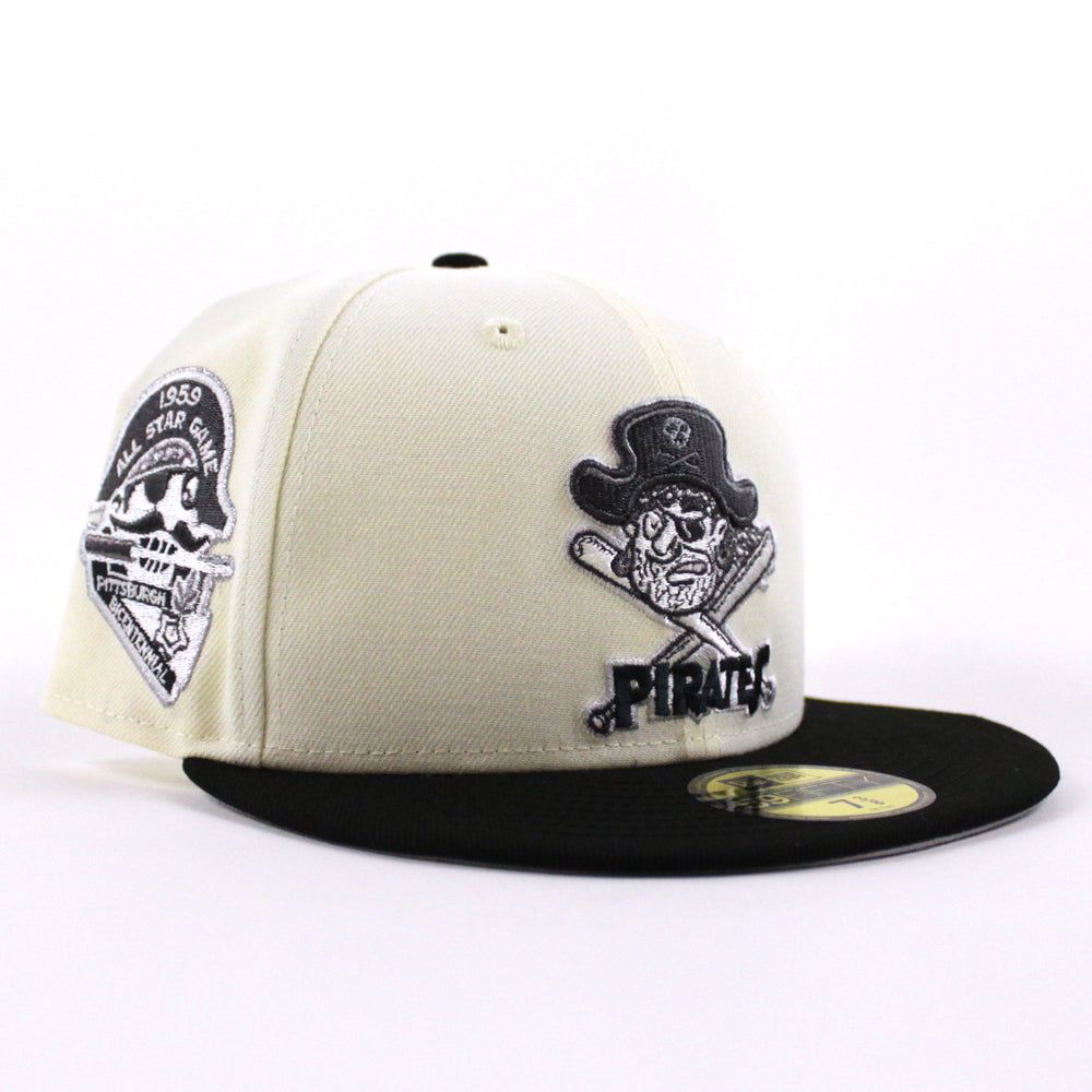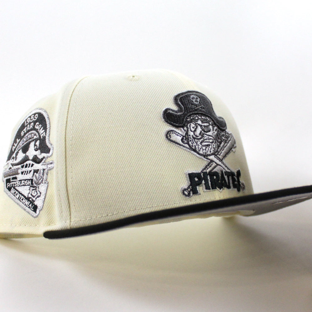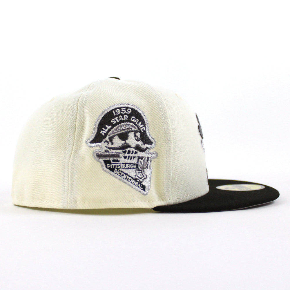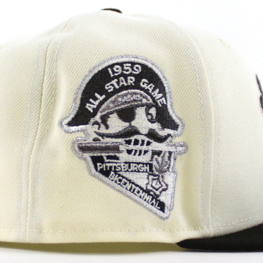 Pittsburgh Pirates 1959 All Star Game 59Fifty New Era Fitted Cap in Chrome White, Black and Gray Under Brim.